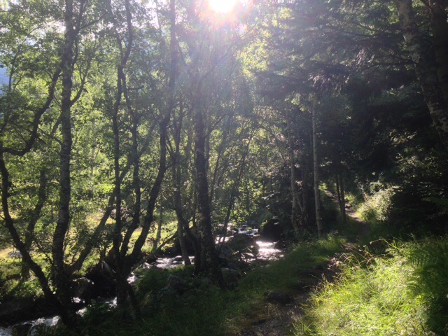 Año 2009. En mi quinto día del quinto bloque de transpirenaica, amanezco, como hoy, en el Camping de Bordas de Graus. Me siento, literalmente, ligera. Comienzo a andar imparable hasta que de repente, sin previo aviso, llega el desfallecimiento total: «la pájara». La única de mi vida. Inolvidable. Seis años después, la misma subida me cuesta más de lo que sería normal. ¿El cuerpo, que en su saber infinito asocia el lugar a la extrema debilidad? ¿O simplemente es que estoy pagando los excesos de ayer y mis piernas se rebelan? Aún así, la tranquilidad de una etapa corta (poco más de 10km) en un día radiante me ha permitido disfrutar más (aún) del paisaje.