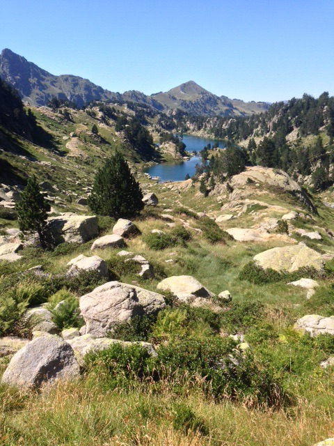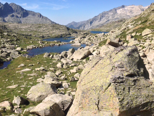 Pero además he disfrutado de la aproximación: del avanzar, siguiendo un arroyo por prados floridos, con la imponente silueta del gigante siempre al fondo. Y he disfrutado de la bajada: «destrepando» por esa roca rojiza y laminada de aristas afiladas sin que, de nuevo, la concurrencia habitual de gente a esta cima especial lo haga todo más peligroso y complicado. Y he disfrutado porque mis pies me han dado un respiro y, desde el momento en que los he metido en las botas han dejado de quejarse (¿me estará pasando como a las antiguas chinas cuyos pies, una vez deformados por vendajes cada vez más apretados ya no soportaban la libertad?). Y he disfrutado de ese larguísimo camino que conduce, por bosques, lagos y prados hasta Les Boulloses. ¡E incluso he disfrutado (en parte) de la lluvia y del granizo que han aparecido al final del recorrido!