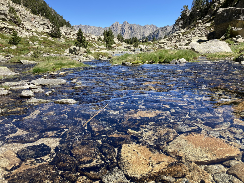 El primero de estos lagos, el estany del Rosari de Àrreu, a dos horas de camino desde Isil, y al que se llega después de haber pasado por el fantasmal pueblo abandonado que le da nombre, es un lago aparentemente poco profundo, de fondo pedregoso, rodeado de pinos que ascienden por laderas empinadas y en cuyo extremo superior se dibujan dos collados que conducen, a su vez, a sendos lagos: el de la izquierda lleva a Garrabea; el de la derecha, al estany superior del Rosari. Y es a este último al que me dirijo con ayuda de la ruta que me he bajado de Wikiloc y de las señales (pocas) que voy encontrando en el no-camino.