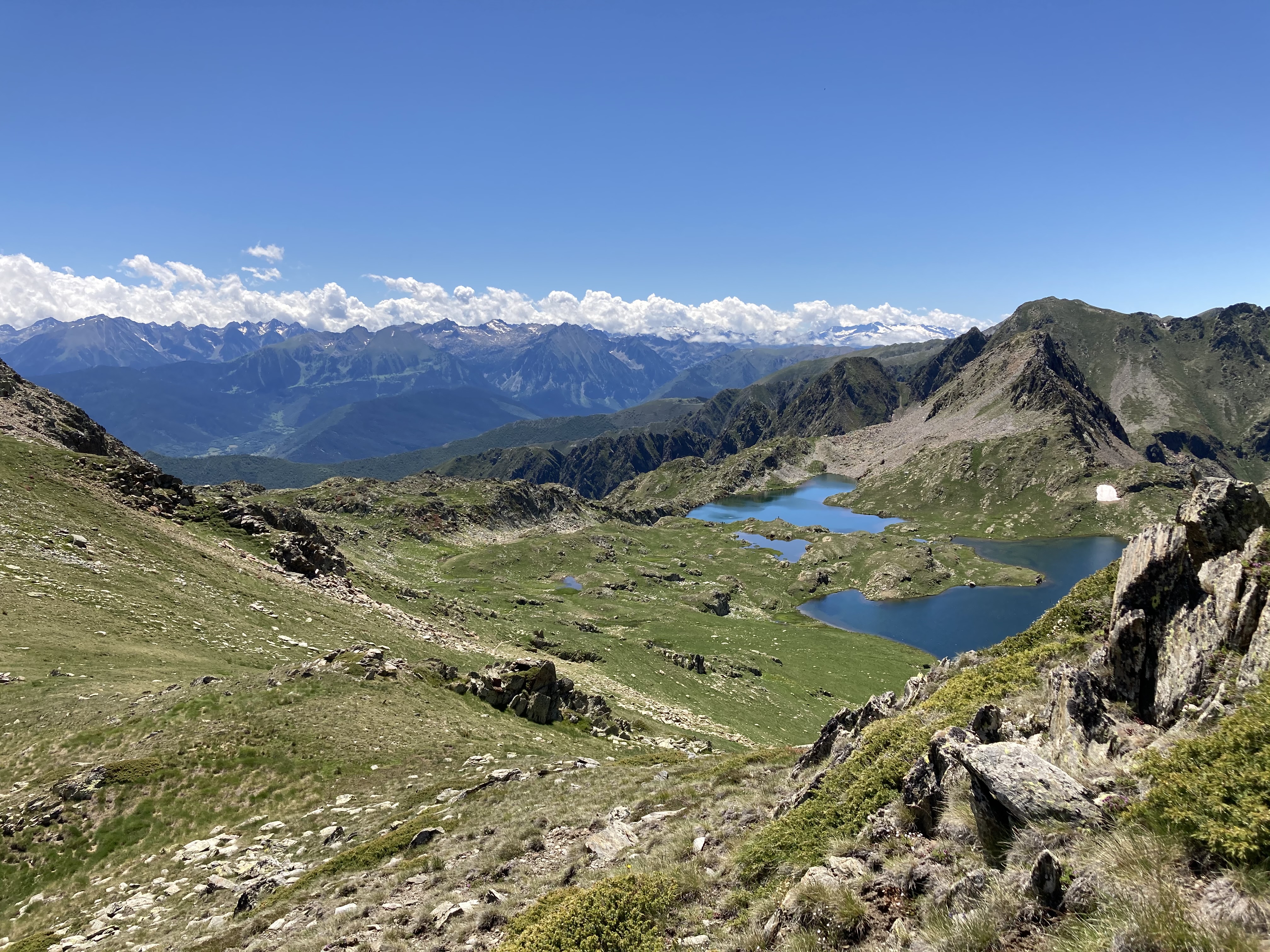 Es la tercera vez que paso por este segundo lago de hoy, el superior del Rosari. ¡Y parece que a la tercera va la vencida! De la primera vez solo recuerdo lo gélido de sus aguas y cómo mi cuerpo, sudoroso y agotado después del ascenso, las recibió cual maná caído del cielo. Nada más. La segunda vez fue en un día gris y frío, y también llegué a él casi agotada después de moverme durante un par de horas entre rocas y rododendros (o nerets, en catalán). Hoy por fin he podido disfrutar de su belleza, que en gran parte tiene que ver con sus entornos abiertos y limpios y con que es un lago que se siente cerca del cielo. El estany superior del Rosari, rodeado entera y únicamente por un manto de suave y verde hierba que se extiende a lo largo de una superficie sorprendentemente amplia y que solo se trasforma en gris cuando asciende hacia los picos cercanos (el Tuc del Rosari y el Gran Tuc de Marimanya), resulta, a la luz de hoy, absolutamente idílico.