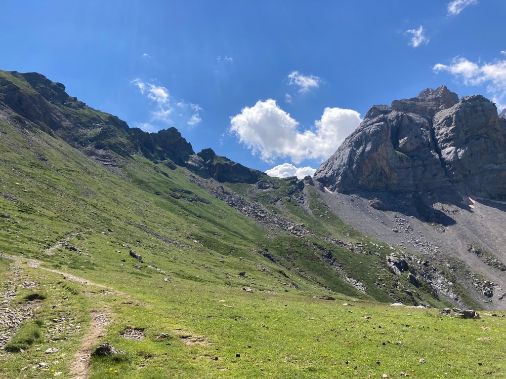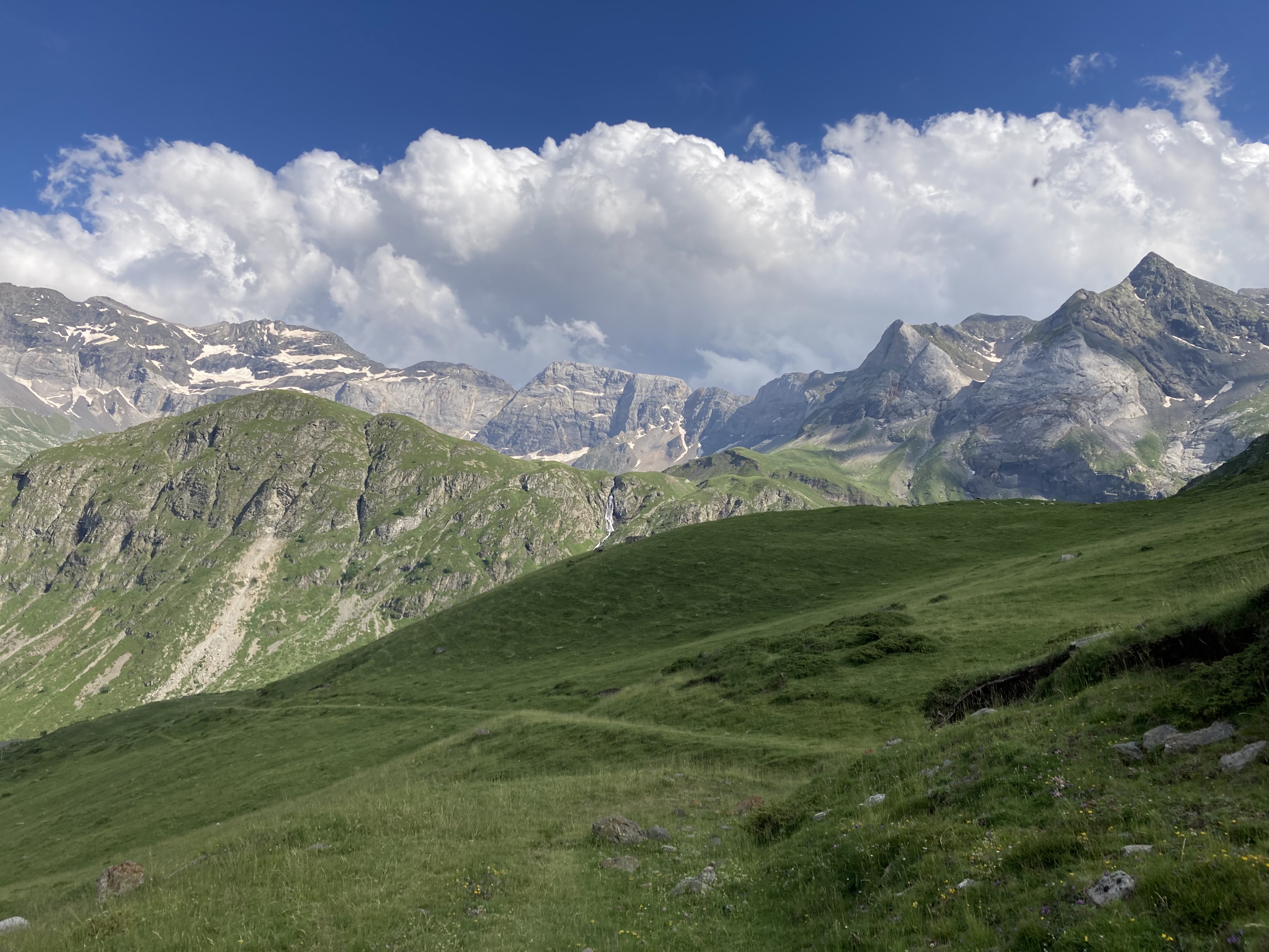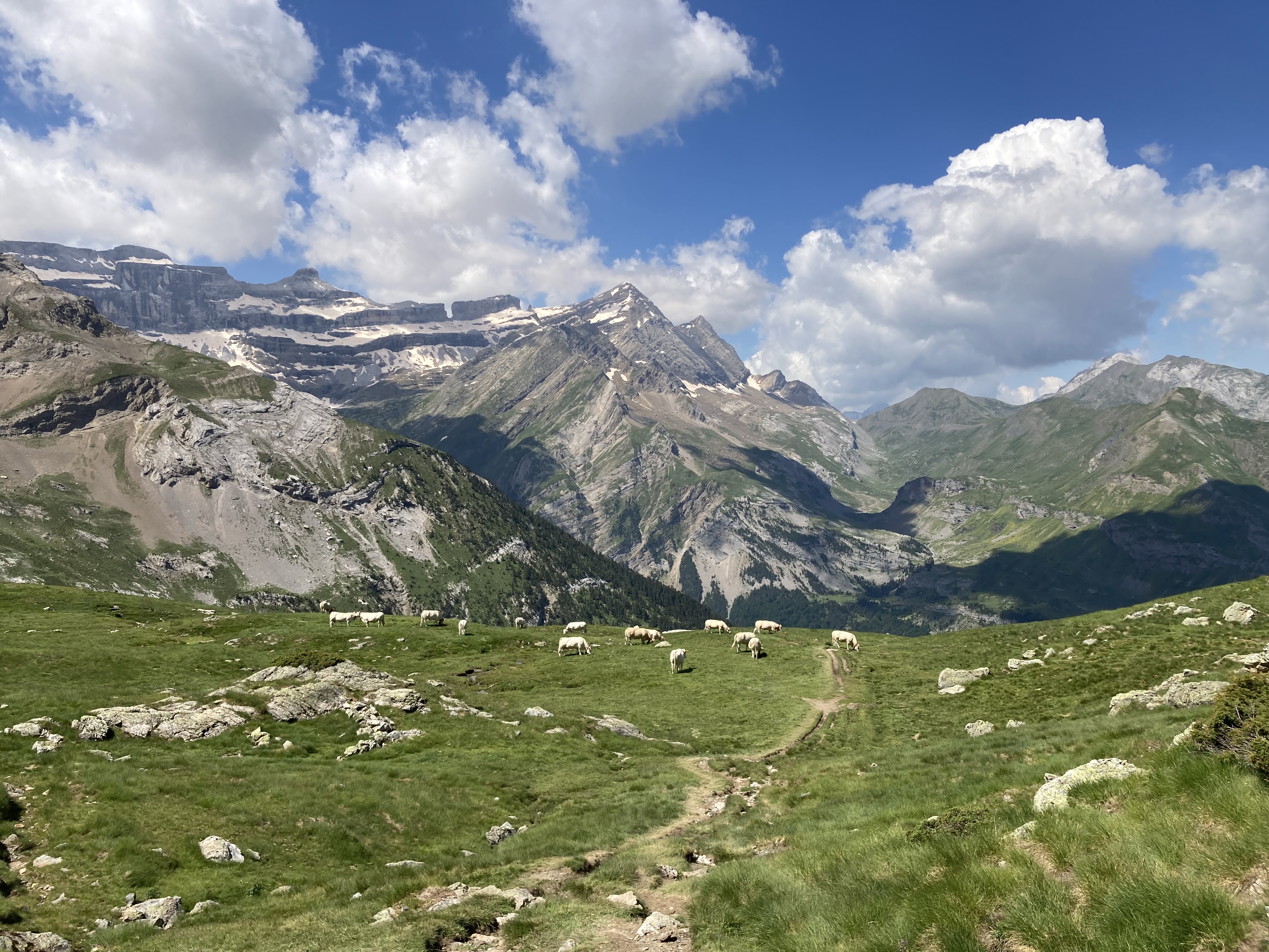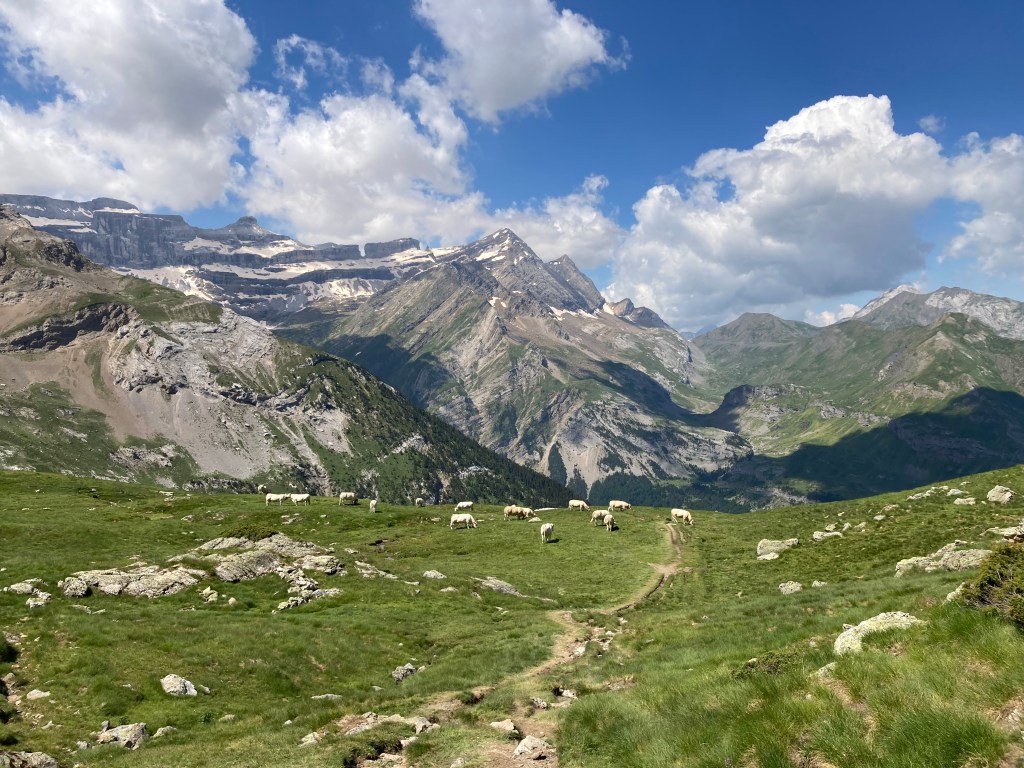 Ha estado conmigo subiendo al refugio de Espuguettes, con su magnífica ubicación mirando, desde el noreste, al circo de Gavarnie. Ha estado conmigo en el ascenso a la Forqueta de Allans, que a pesar de ser una subida amable, hoy se ha hecho muy dura. Y ha estado conmigo al final de la etapa, en el breve ascenso junto al Lac des Gloriettes, en los kilómetros costeando a partir de él, y en la abrupta bajada hasta Hèas, el punto de llegada, un minúsculo municipio a los pies del Circo de Troumouse, formado por apenas una iglesia y un Auberge-Camping, La Munia, donde, ¡gracias Diosa!, hoy sí había una habitación libre.