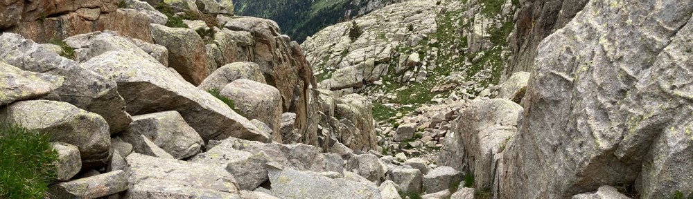 Desde Viadós, en el Valle de Gistaín, en el municipio de San de Juan de Plan, hasta Benasque, la ruta más habitual es la que rodea por el norte el macizo del Posets y baja a Benasque por el Valle de Estós. Un día, unos veinte kilómetros. Pero como me veo con fuerzas, me animo con lo difícil: dos etapas atravesando el citado macizo, pasando muy cerquita de varios de sus tresmiles y parando en medio en el refugio de Ángel Orus. Un verdadero empacho de piedra, y también de agua.