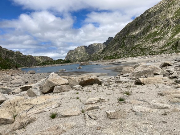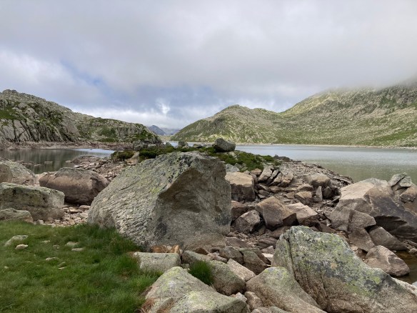 Calculo que han sido unas tres horas más que si hubiera elegido la opción corta pero han sido tres horas de disfrutar de andar, constantemente, junto a uno y a otro y a otro lago más. Y también tres horas de ginkana constante siguiendo caminos mínimos señalizados con esos montoncitos de piedra que a veces se ven, a veces se intuyen y a veces… no hay manera. Esa es también la diferencia entre moverse por un GR (muy bien señalizado) o salirse de él (depende) ¿Frío? Ninguno. No ha llegado a hacer sol pero sí he visto su pelea por asomar y sus mínimos momentos de victoria.