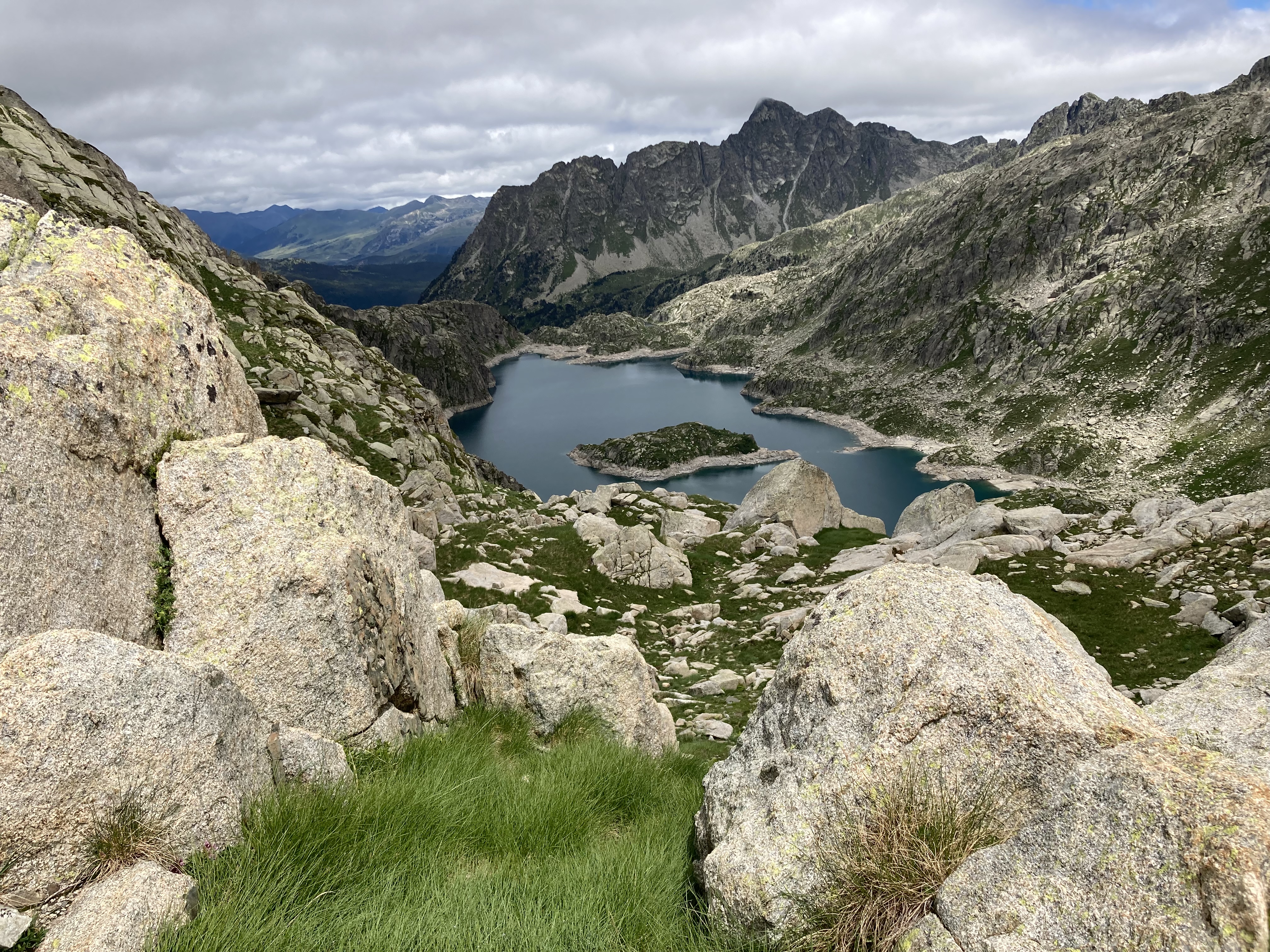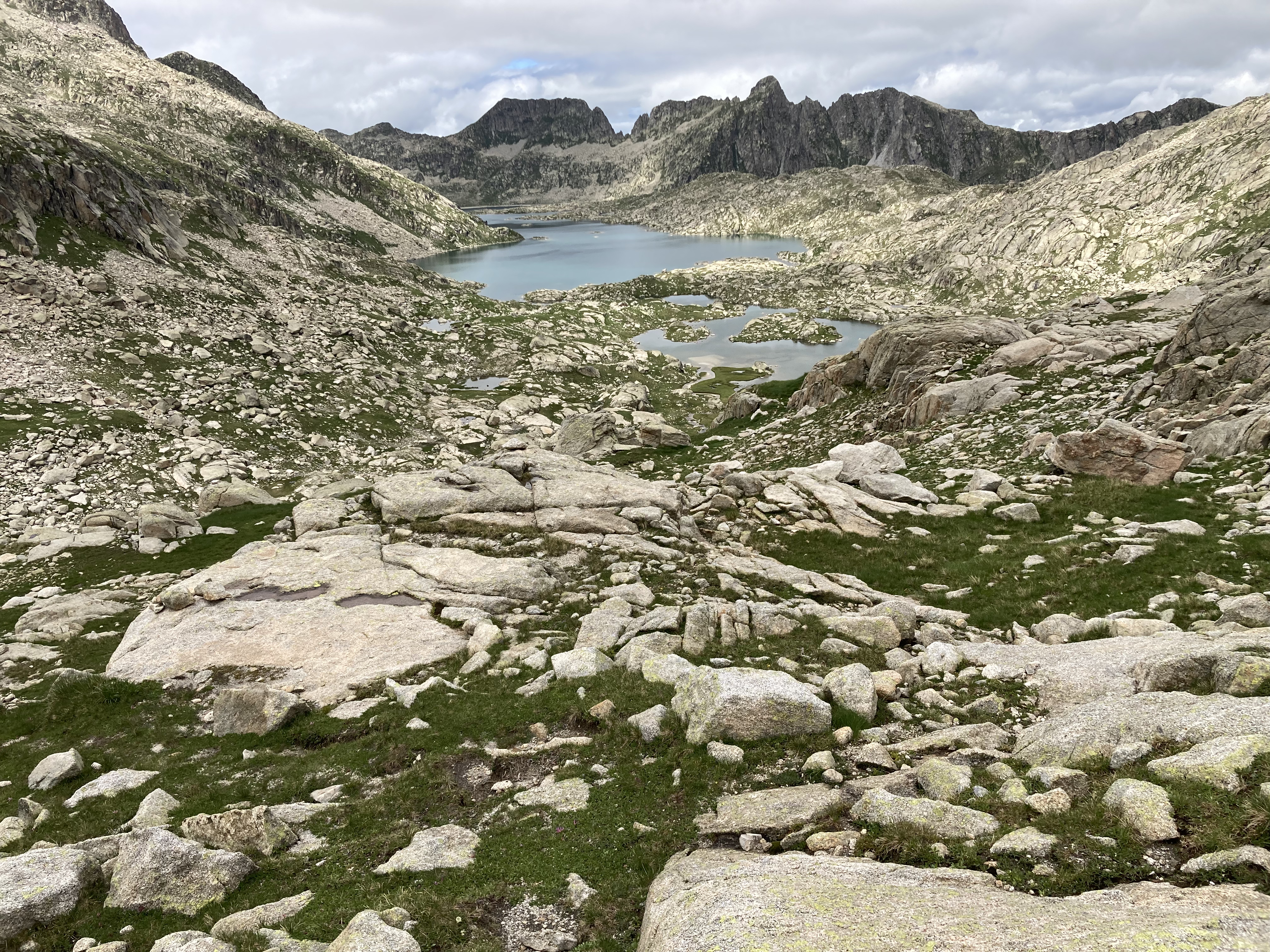 Calculo que han sido unas tres horas más que si hubiera elegido la opción corta pero han sido tres horas de disfrutar de andar, constantemente, junto a uno y a otro y a otro lago más. Y también tres horas de ginkana constante siguiendo caminos mínimos señalizados con esos montoncitos de piedra que a veces se ven, a veces se intuyen y a veces… no hay manera. Esa es también la diferencia entre moverse por un GR (muy bien señalizado) o salirse de él (depende) ¿Frío? Ninguno. No ha llegado a hacer sol pero sí he visto su pelea por asomar y sus mínimos momentos de victoria.