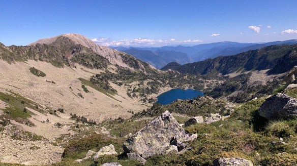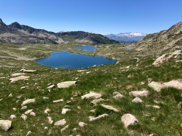 Pero el día ha sido increíble. La temperatura magnífica. La soledad casi total. La perspectiva infinita. La Maladeta guardándome las espaldas durante más de la mitad del camino, mientras ascendía, suavemente, viendo la sucesión de prados, ríos y lagos. El crestear a más de 2600m de altura tocando un cielo de un azul tan intenso como el de los lagos en los que se reflejaba. Porque una vez en la cima, en la primera cima, mire a donde mire, solo veo azul, verde y lagos: al suroeste, los de Bacivèr, de donde vengo; al noroeste, los del Clòt der Os; al noreste, los de Marimanha; al sureste los del Rosari y el de Airoto; y muy cerca de la cima más alta, la del Rosari de Bacivèr, el pequeño Estany Gelat. ¿Qué importa si para llegar ahí he tenido que subir por un no-camino casi vertical a través de una pedrera cuyos pocos y esporádicos hitos ayudan más bien poco?