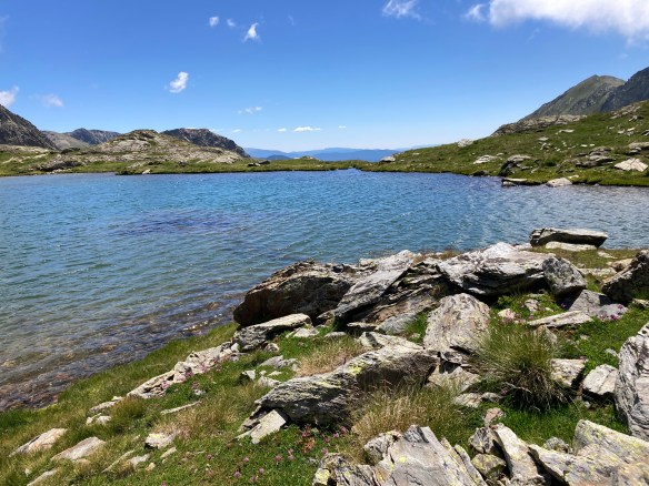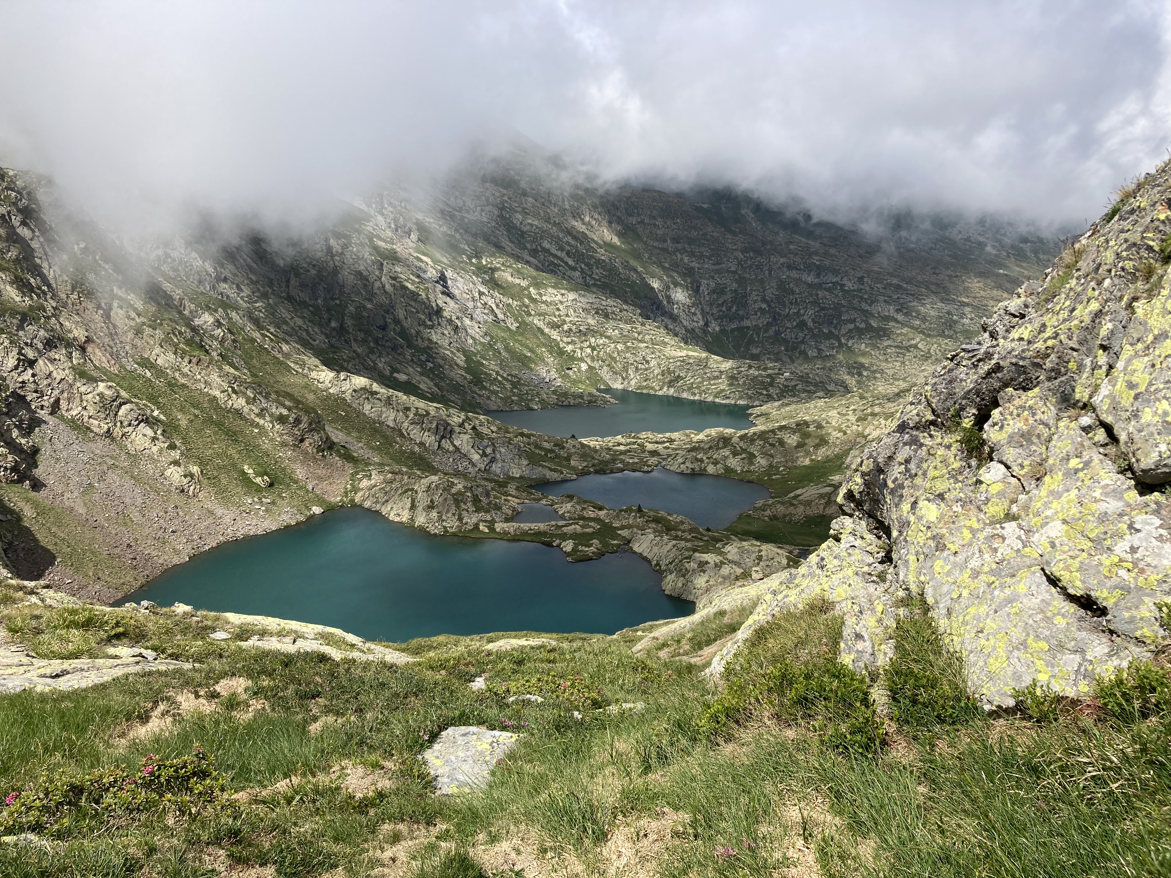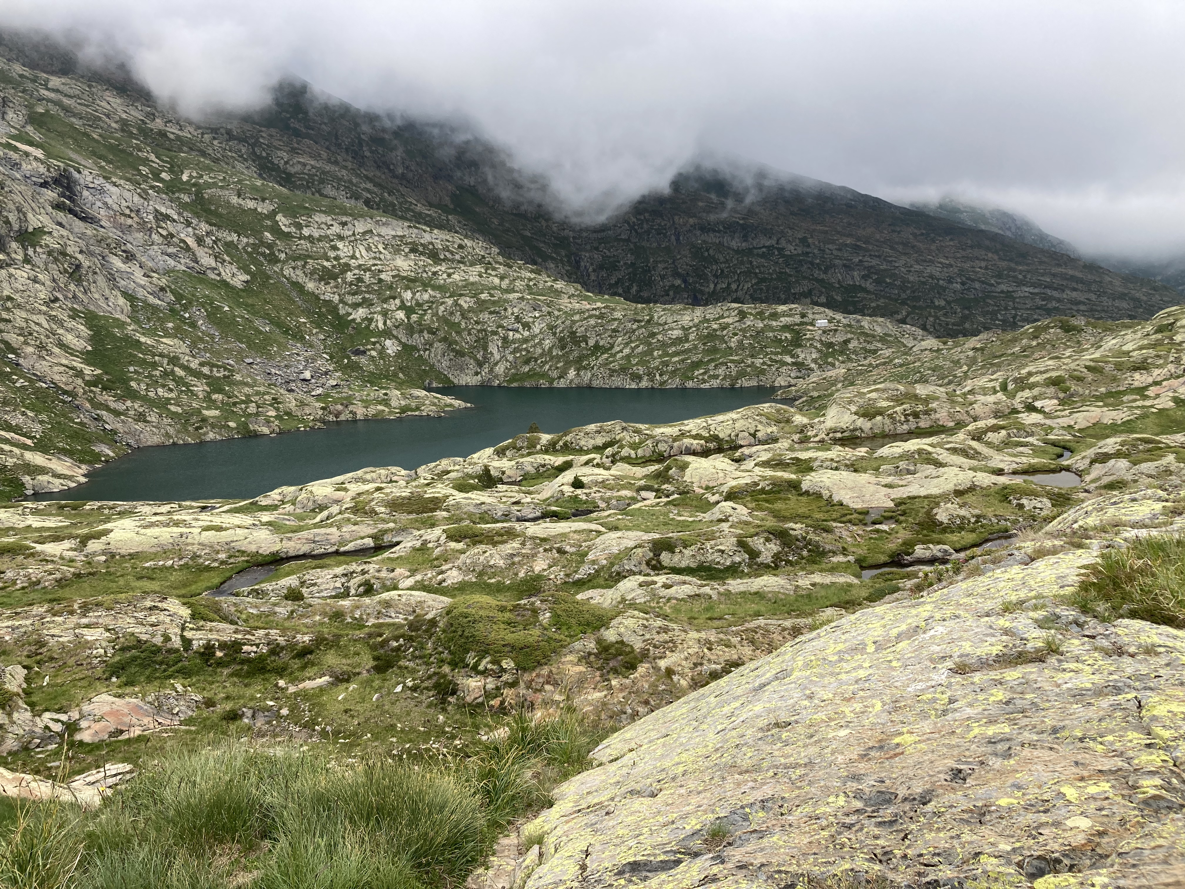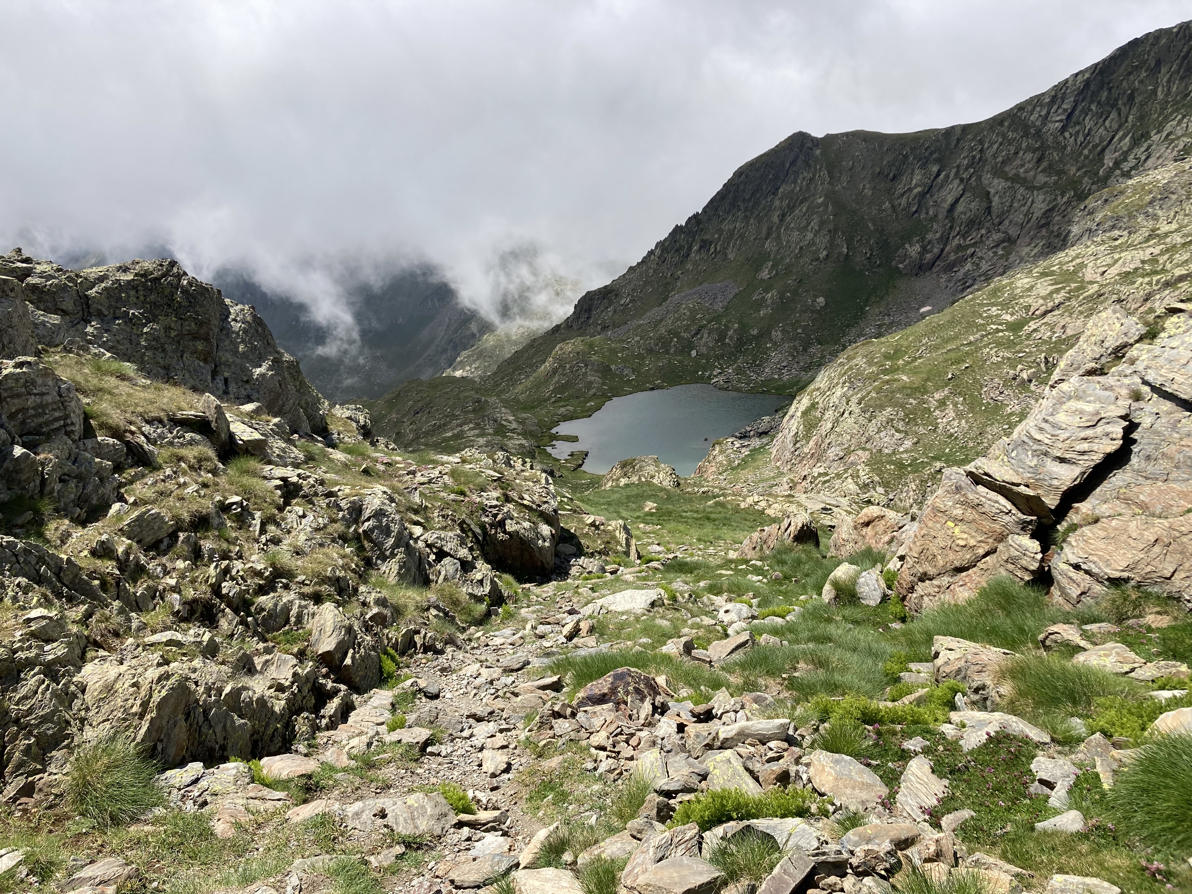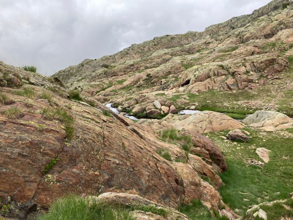 Hoy, tercera vez, era mi desquite. Y sí, he subido a la Cornella, siguiendo las indicaciones de dos mujeres estupendas que me he encontrado en el camino y de las que me fío totalmente porque viven por aquí: una en Alos y otra en Ferrera. Y sí, he recordado lo duro de esa subida y lo esquivo del collado, que no llega nunca. Y sí, y a pesar de que la niebla –la gabacha, como la llaman por aquí– ha hecho acto de presencia, he podido volver a contemplar la espectacular sucesión de lagos que son los lagos de la Gallina con su hermosísima piedra veteada por la que se va deslizando el agua en su camino a los hasta siete lagos inferiores. Y también he disfrutado de las muchas ranas que saltan a mi paso, y del laberinto que es el sendero con sus muchos saltos, desniveles, desescaladas, pasillos y escalones.