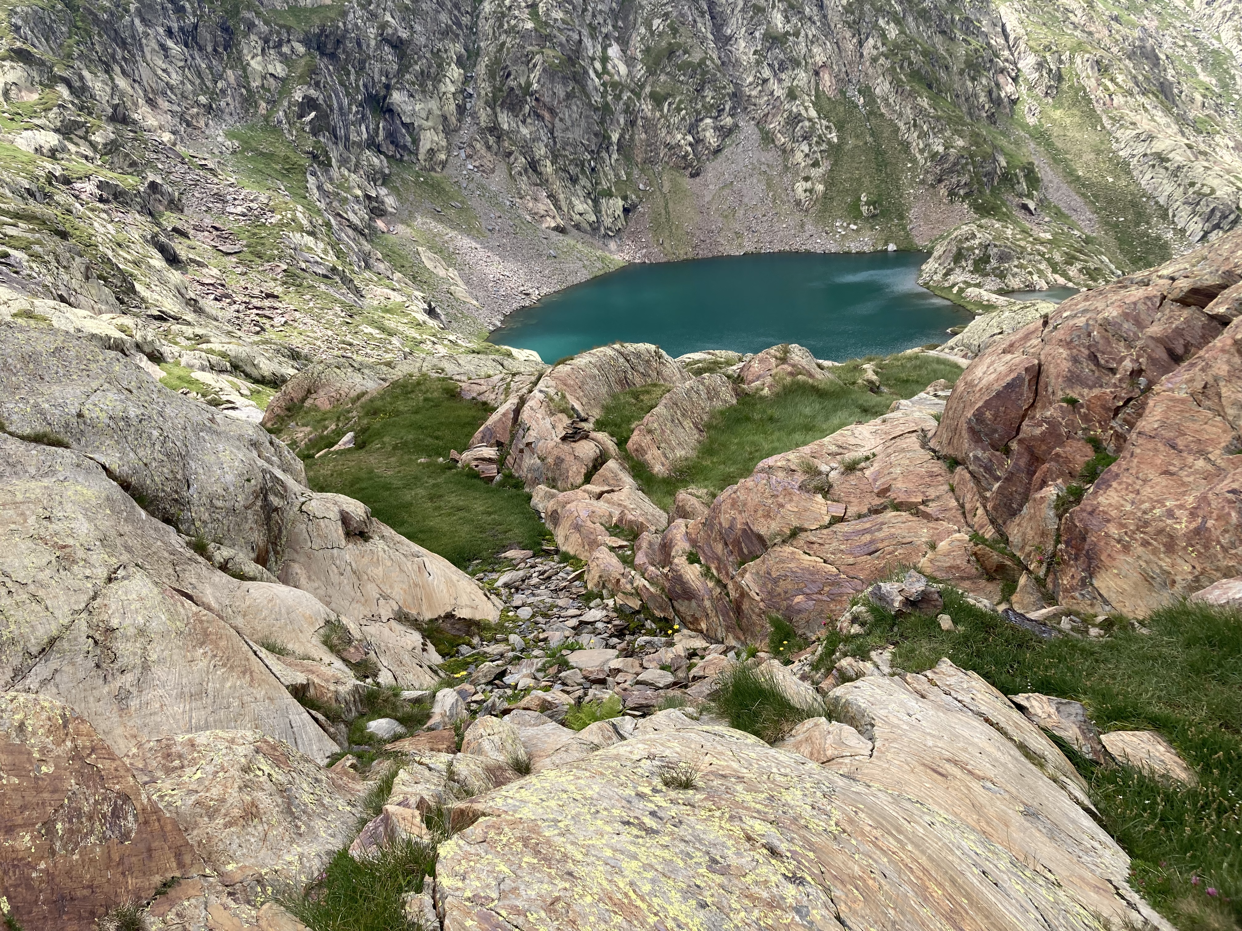 La sucesión de lagos empieza poco después del Coll de Calberante (2600m) y acaba en el refugio que hay en la base del Montroig (2287m), una especie de nave espacial metálica en cuyo interior hay unas cuantas literas y una radio para avisar de posibles emergencias. He bajado despacio, muy despacio, porque la retina no se conformaba con lo que veía y quería fotografiarlo todo, y porque es un sendero complicado. Complicado de encontrar, de seguir y de andar, porque discurre casi totalmente por piedra, aprovechando sus pendientes, sus recovecos y sus irregularidades. Porque esta piedra no son bloques de granito que quedan tal como caen, como ocurría en días anteriores, sino que es una piedra pulida que adopta la forma de toboganes, colinas y escaleras. Una piedra que podría ser madera. Una piedra hermosísima en sus colores y en sus formas.