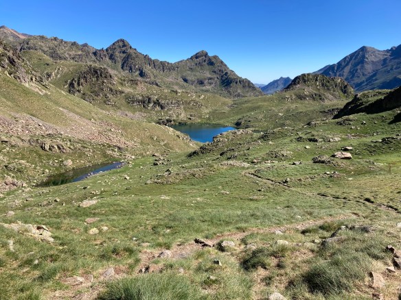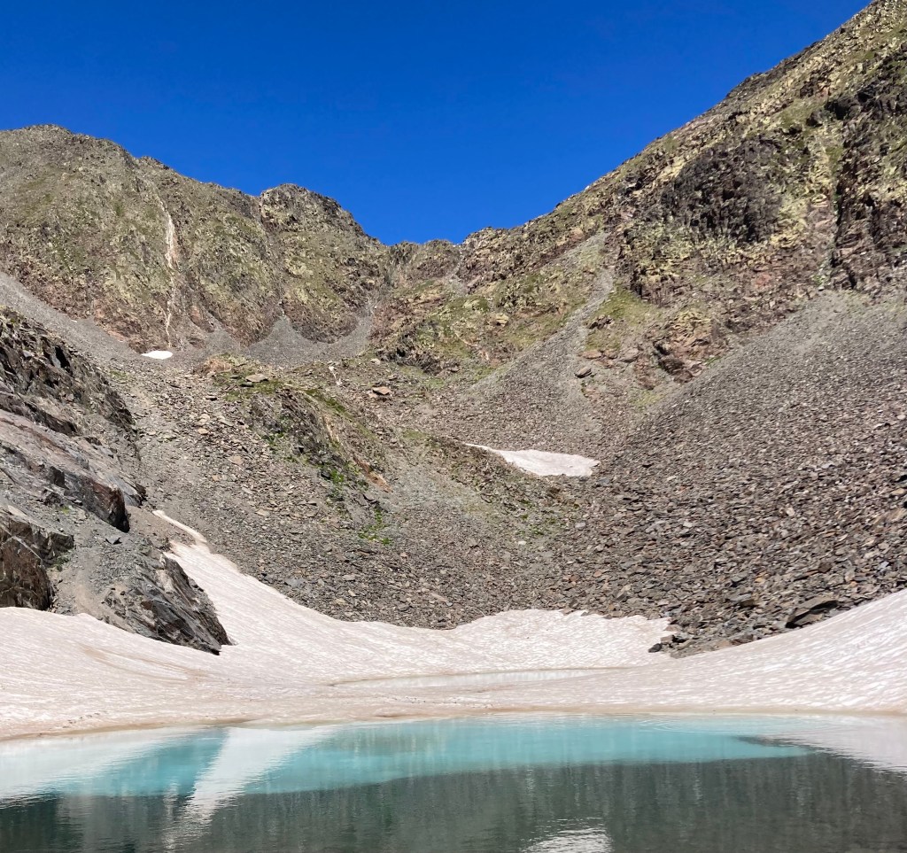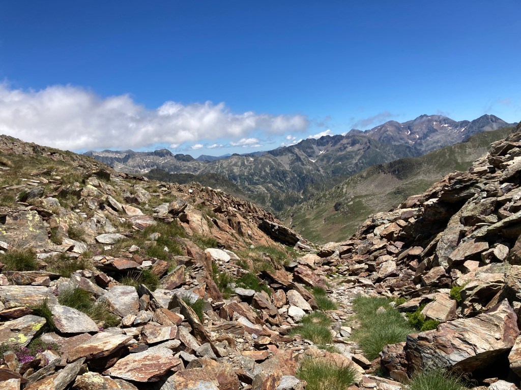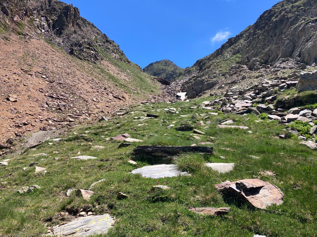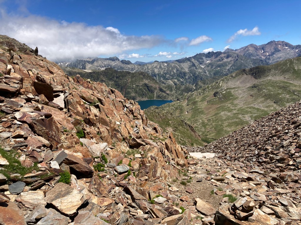 El caso es que he descubierto otra forma de aproximación a esta montaña –desde el noroeste, en vez desde el suroeste–, he podido pasar por el lago de Besines y comer una omelete en el refugio del mismo nombre (en una terraza de vistas impresionantes), y he tenido que atravesar el Col de la Coume d’Anyell, lo que me ha devuelto la posibilidad de extasiarme con la belleza de uno de esos circos rocosos pirenaicos que, entre tanto verde, ya estaba echando de menos este año.