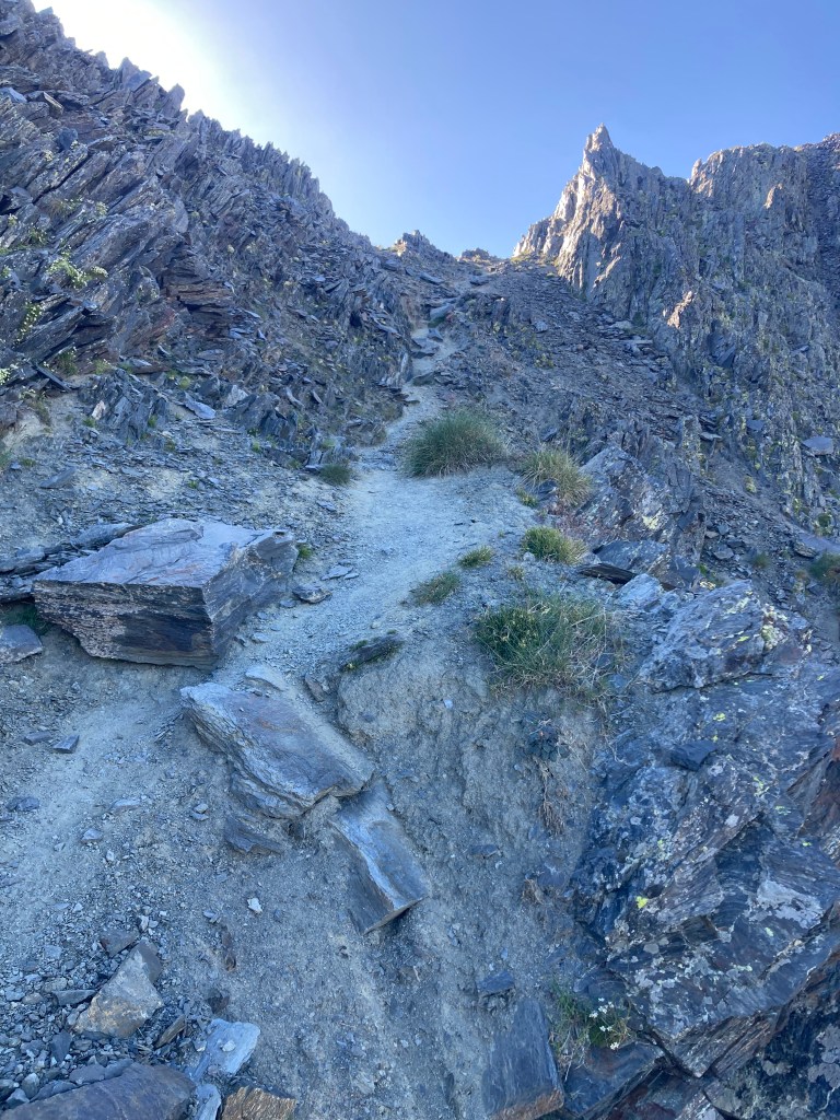 Y a las seis me levanto, echo a andar a las siete, y a las ocho estoy en la base misma de esta, mi montaña mágica, contemplando con veneración su tramo final: un zigzag vertical recortado en la piedra que desde aquí parece un camino de penitencia pensado para grandes pecadores. Si fuera religiosa me habría santiguado, (¡y he tenido la tentación de hacerlo!) pero como no lo soy, solo le he dado las gracias a mi particular diosa de las montañas por darme la idea de dormir cerca y poder comenzar a recorrer este tramo final en absoluta soledad. ¡Gracias diosa!