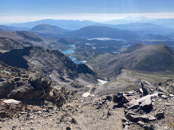 Llegar a la cima del Carlit, a 2921m, es llegar al Paraíso. Y más un día como hoy, con un cielo azul perfecto y una temperatura que permite estar de manga corta a las diez de la mañana mientras el resto del mundo se cuece. La vista es una de las más hermosas del Pirineo, no solo porque al este se extiende el paisaje increíble de las Bouillouses (o Bullosas), con sus múltiples lagos, sino porque, al contrario que otras cumbres (especialmente las de esta envergadura), el Carlit es una montaña relativamente aislada, lo que le da una perspectiva del todo excepcional. Pero también es una cumbre muy transitada, especialmente en un día como hoy, 14 de julio, fiesta nacional en Francia. Y aunque cuando una está en el Paraíso lo último que quiere es irse de allí, tampoco quiero quedarme demasiado tiempo porque el comienzo de la bajada es complicado y peligroso y es mejor hacerlo sin demasiada gente. No hay camino. Solo marcas que indican por dónde «descolgarse» mejor. Eso sí, hay muchos sitios donde agarrarse y a mí, lo de trepar y destrepar, siempre me ha gustado. Un poco de concentración y sin problemas. Después ya solo queda recorrer los siete kilómetros que faltan hasta la presa mientras los lagos se vuelven más y más cercanos, disfrutar de la comida en Les Bones Hores y coger el autobús que me acerca al mundo civilizado. Porque, ya lo he decidido, por ahora lo dejo aquí. Demasiado calor.