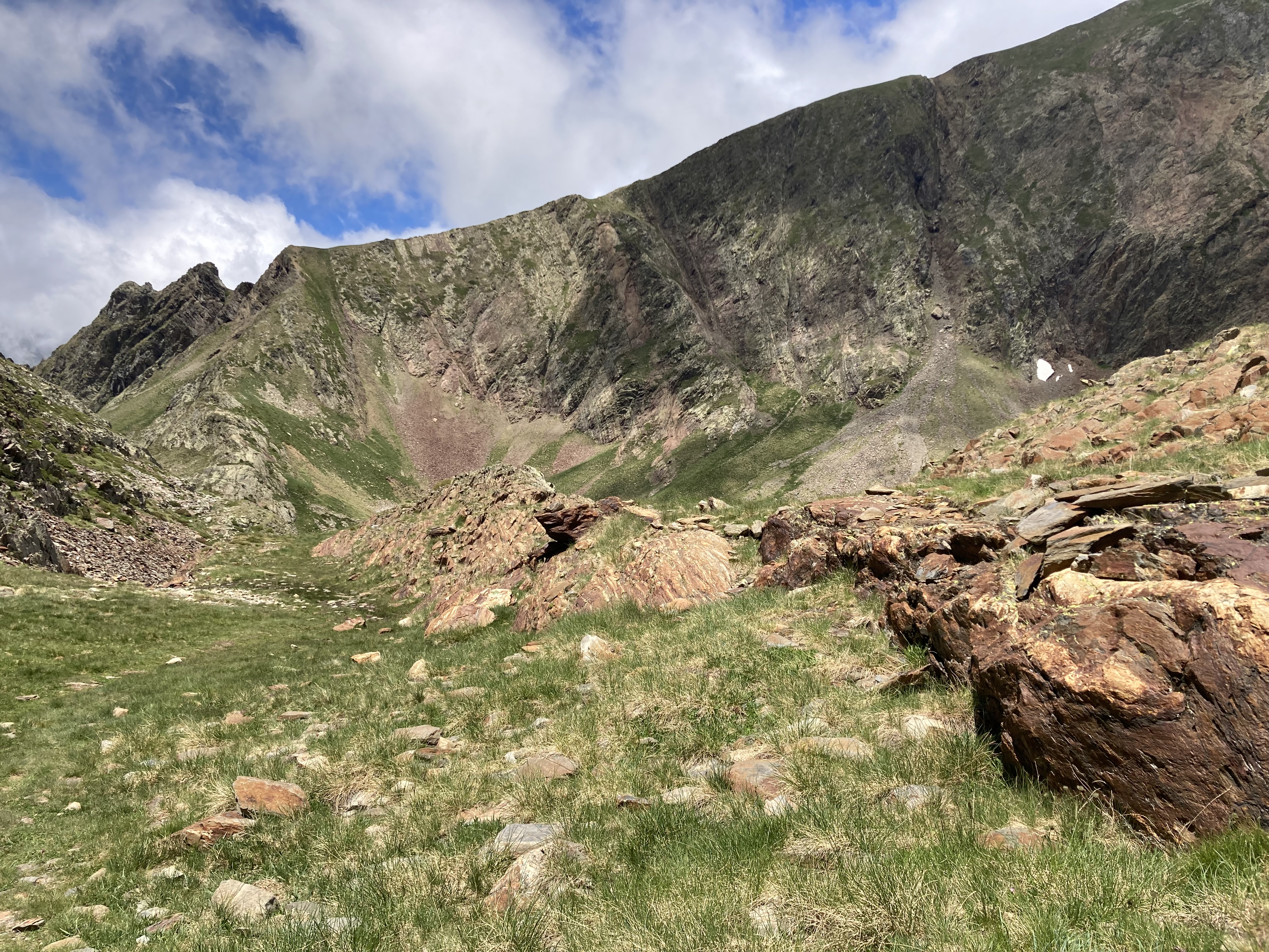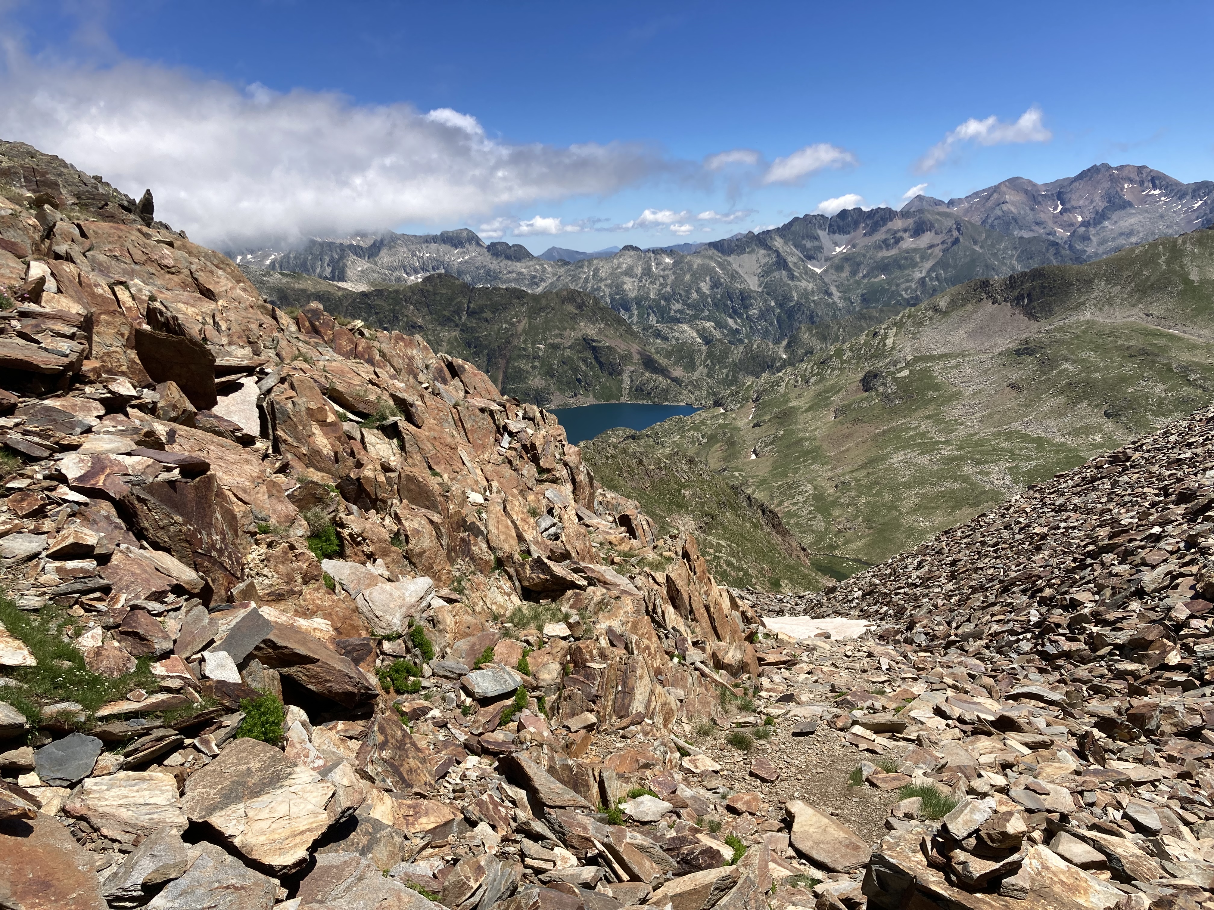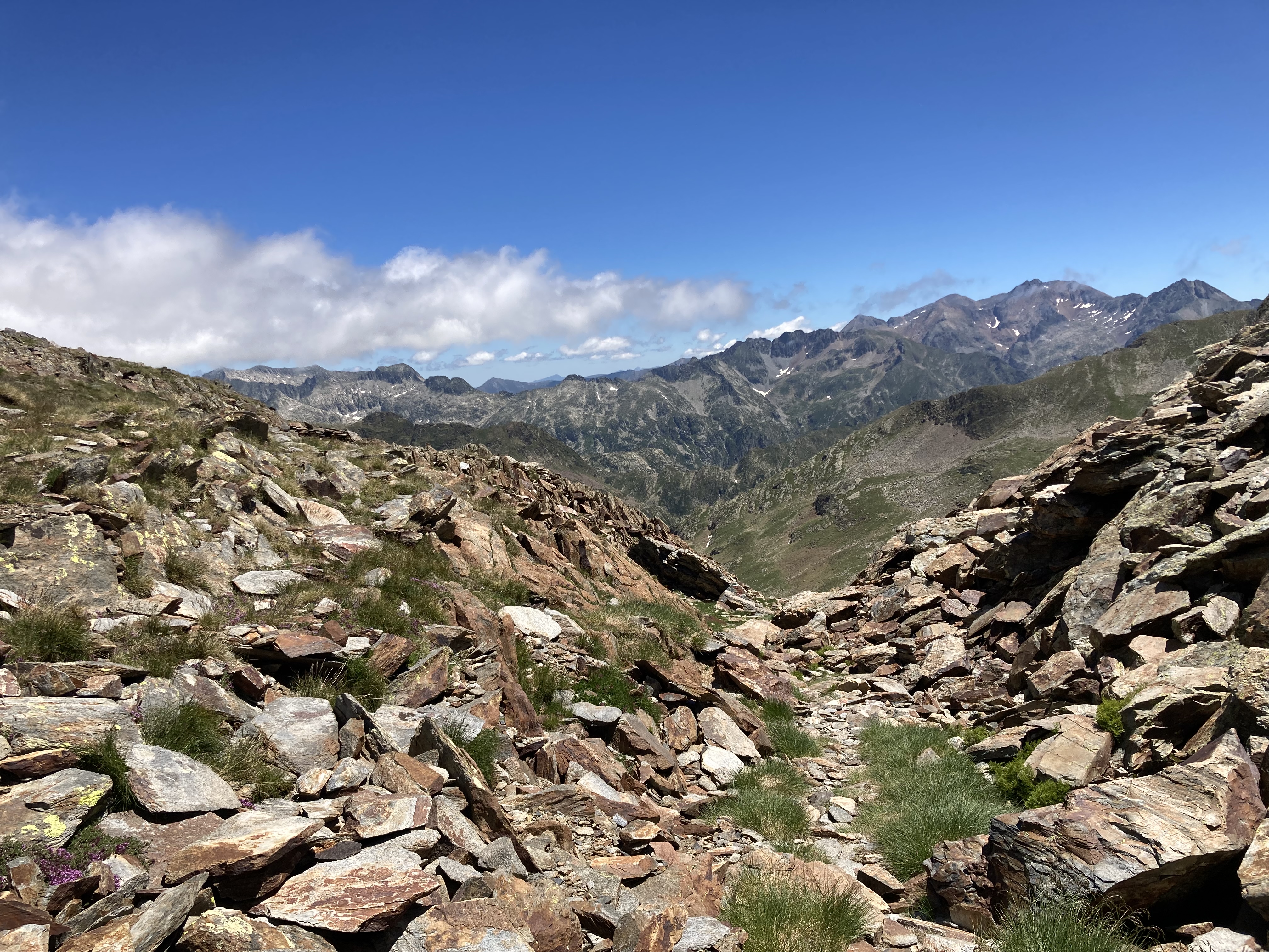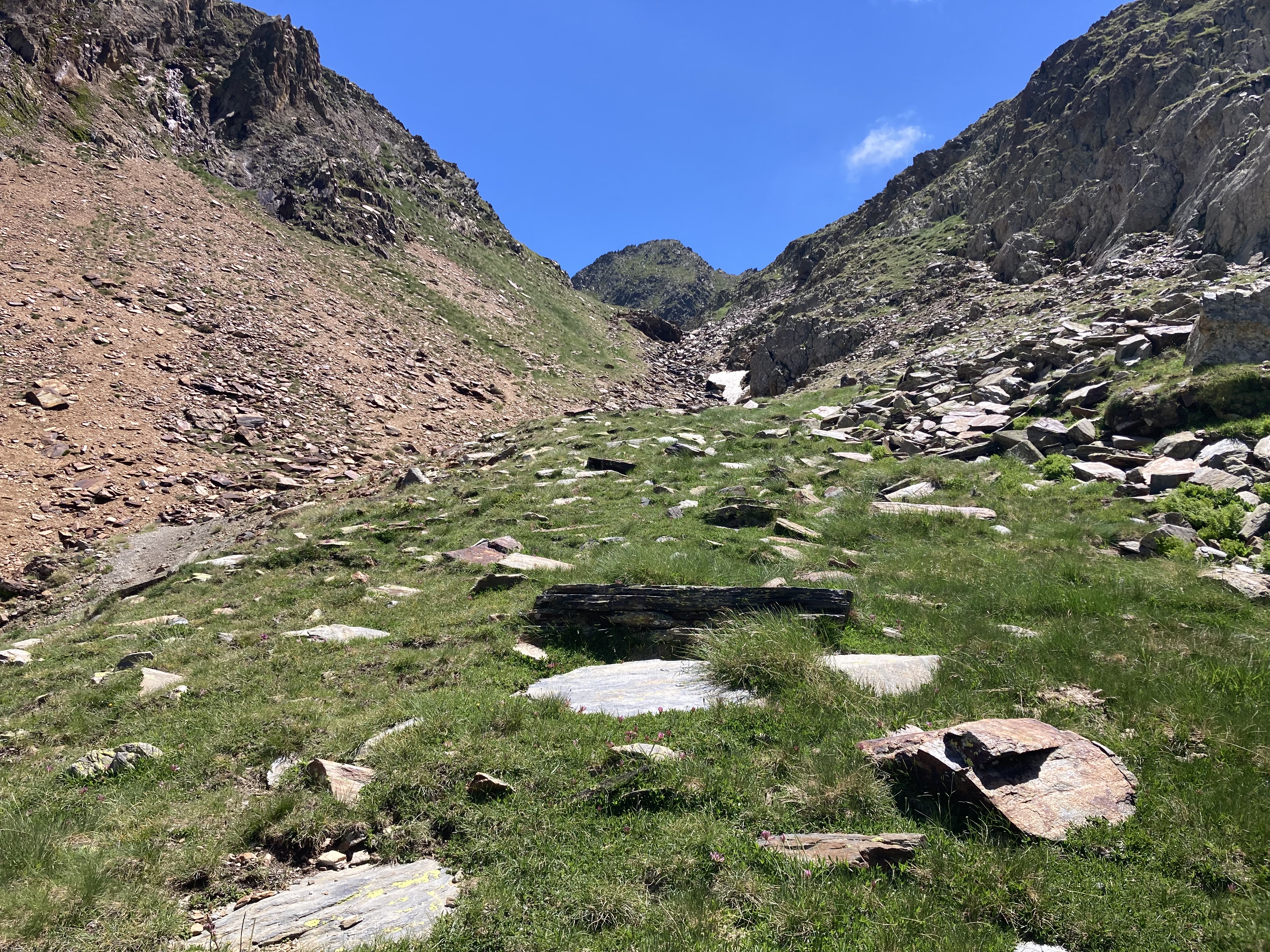 El caso es que he descubierto otra forma de aproximación a esta montaña –desde el noroeste, en vez desde el suroeste–, he podido pasar por el lago de Besines y comer una omelete en el refugio del mismo nombre (en una terraza de vistas impresionantes), y he tenido que atravesar el Col de la Coume d’Anyell, lo que me ha devuelto la posibilidad de extasiarme con la belleza de uno de esos circos rocosos pirenaicos que, entre tanto verde, ya estaba echando de menos este año.