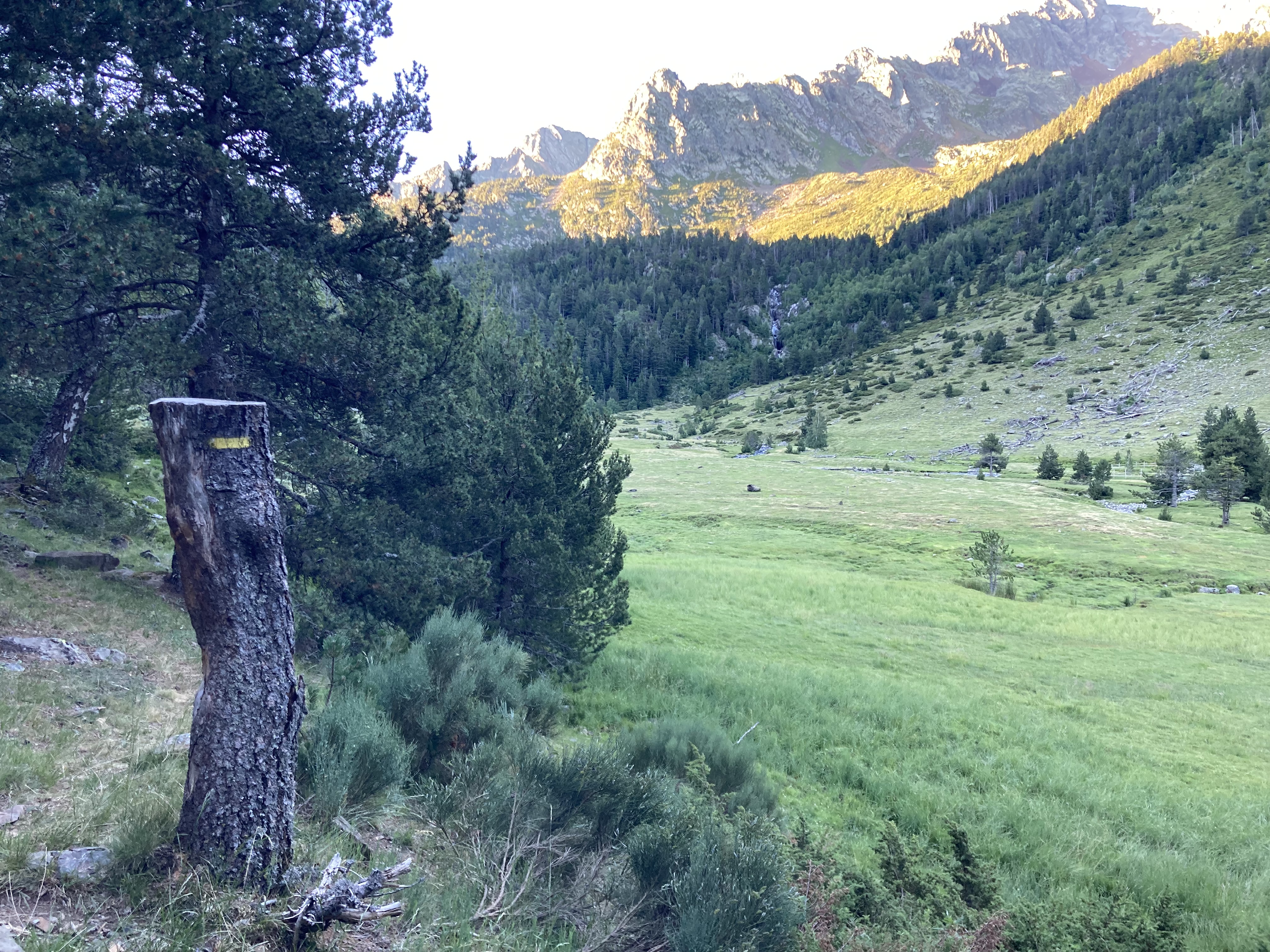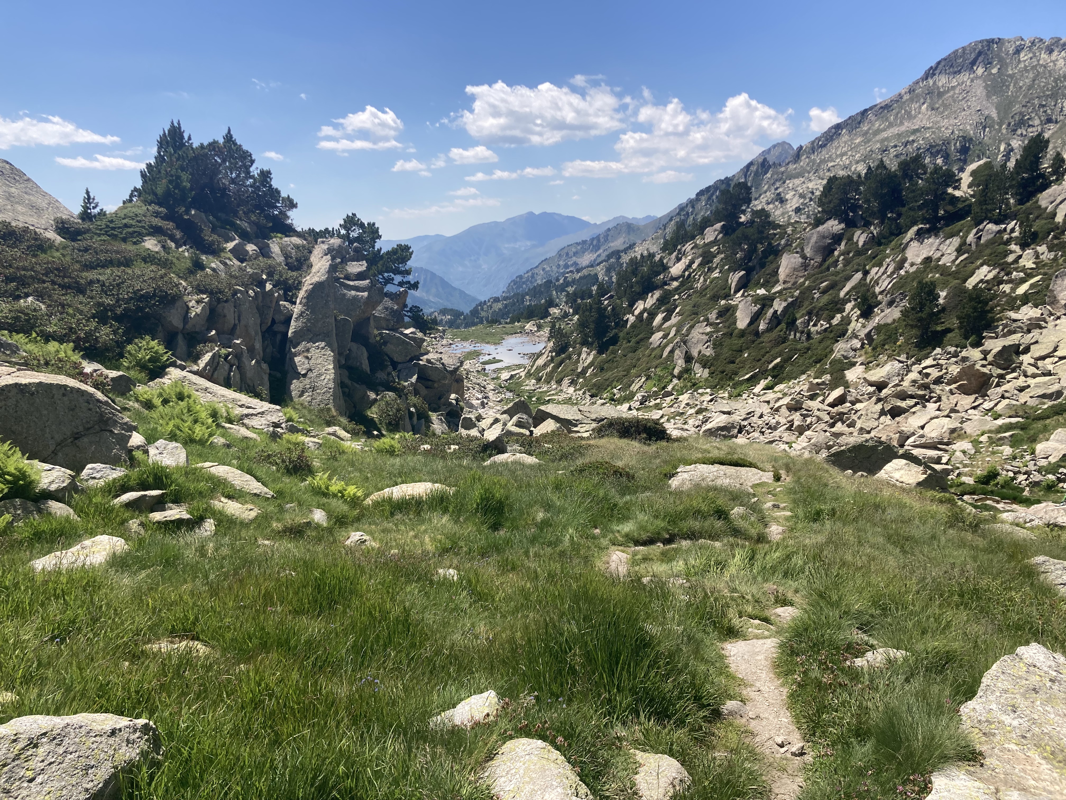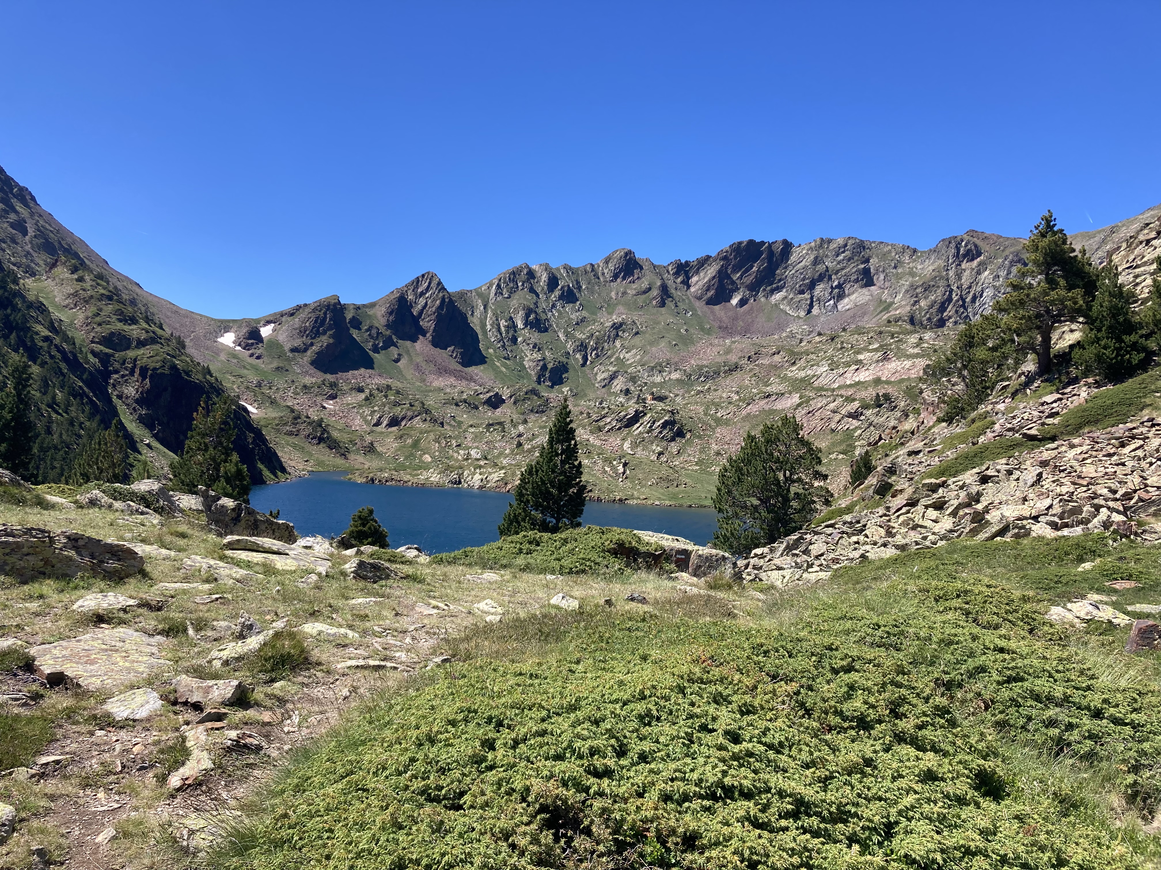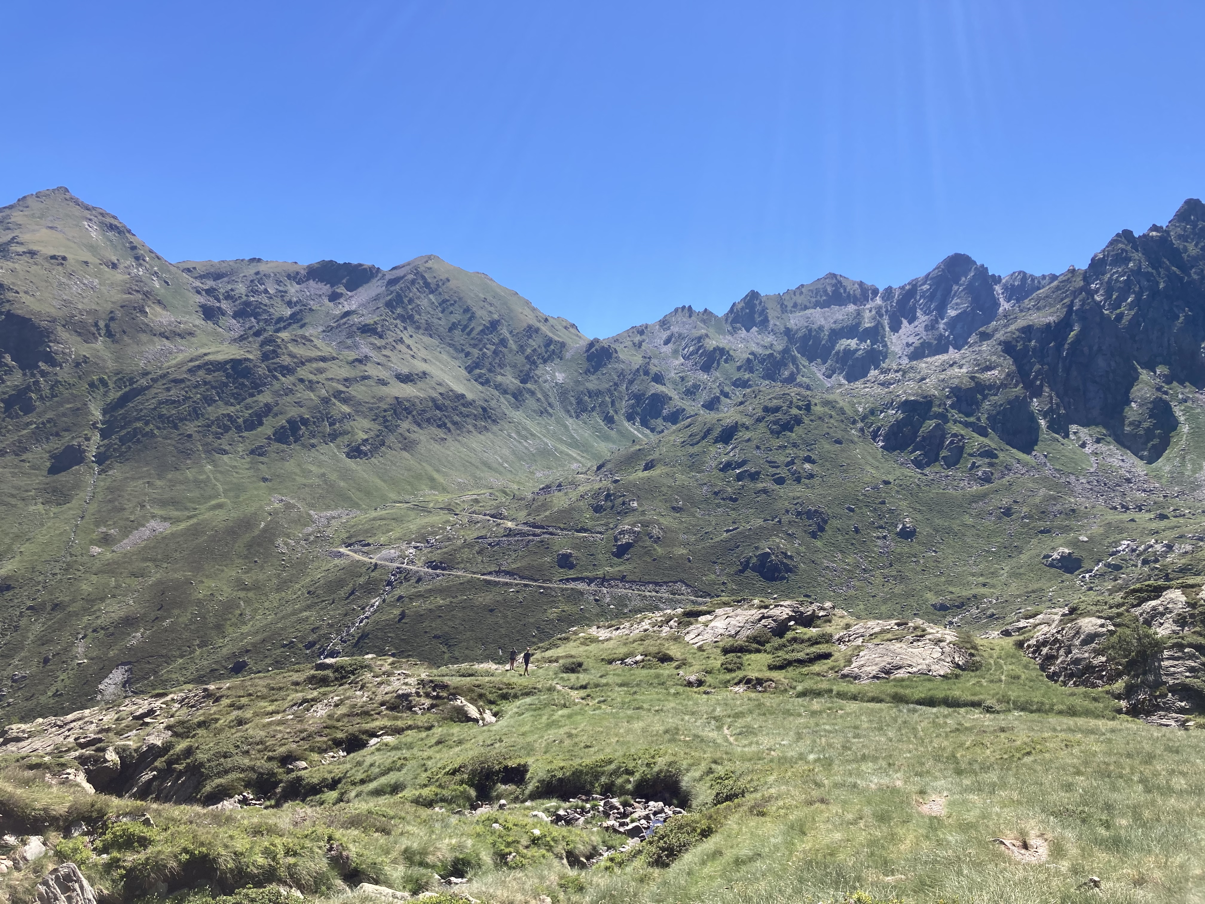 El caso es que he descubierto otra forma de aproximación a esta montaña –desde el noroeste, en vez desde el suroeste–, he podido pasar por el lago de Besines y comer una omelete en el refugio del mismo nombre (en una terraza de vistas impresionantes), y he tenido que atravesar el Col de la Coume d’Anyell, lo que me ha devuelto la posibilidad de extasiarme con la belleza de uno de esos circos rocosos pirenaicos que, entre tanto verde, ya estaba echando de menos este año.