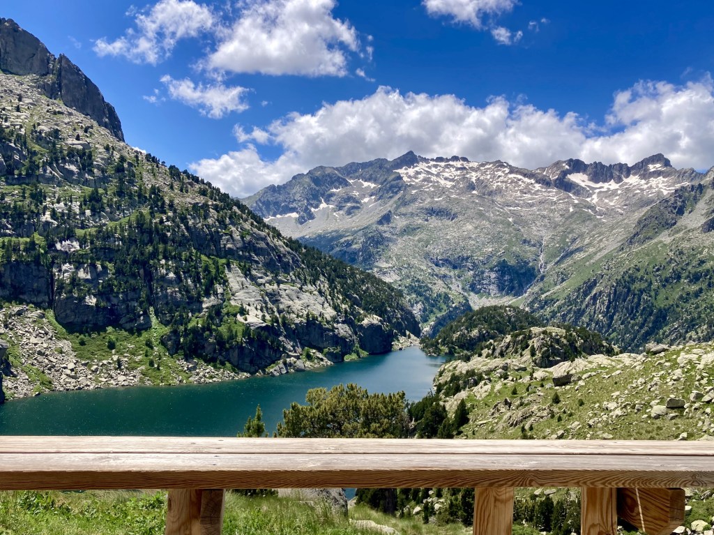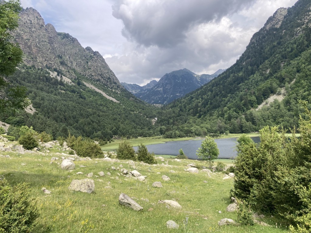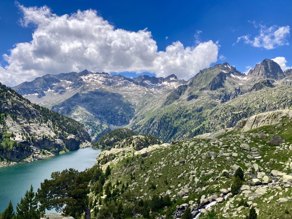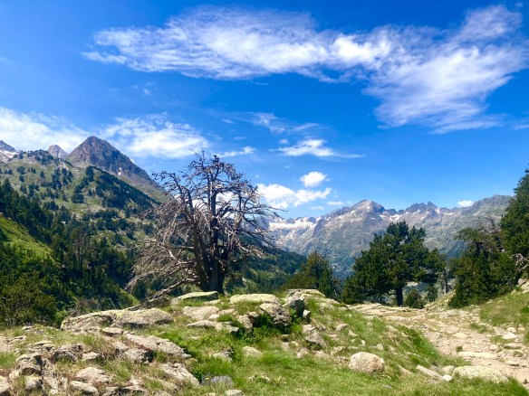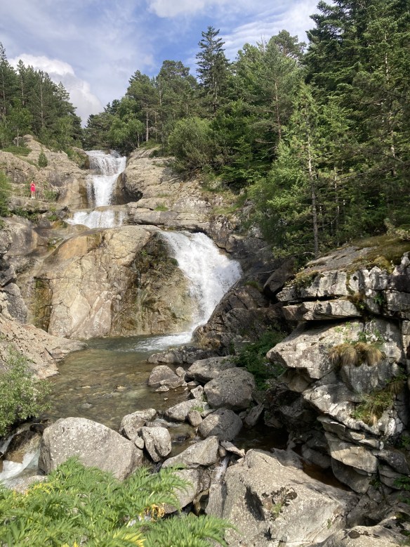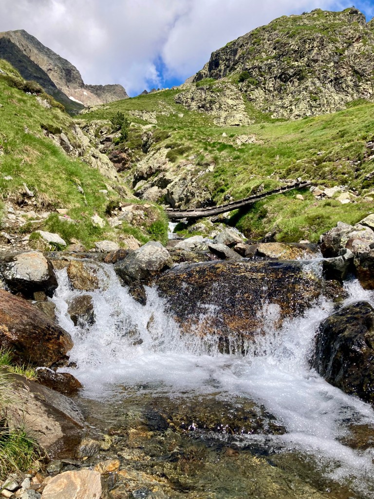 Volviendo al Planell de Aigüestortes, ayer también estuve aquí. Pero no subí en taxi, vine andando desde el parking. Son unos seis kilómetros y unos 450m de desnivel por un sendero precioso que comienza entre fresas, atravesando un bosque, y finalmente se abre al llegar al estany de la Llebreta. Después, sigue río arriba y culmina, poco antes del llano, en un encadenamiento de pequeñas cascadas con profundas pozas redondas en su base: una formación geológica que recibe el sugerente nombre de «marmitas de gigante». Me viene Jorge Manrique a la cabeza. Si un río es una vida, cada «marmita» podría ser una relación. Un aparente remanso en el que una queda «circulando» durante un tiempo hasta que la fuerza de las aguas, de la vida, de la voluntad, del frío gélido del fondo, la impulsan a la siguiente cascada, a la siguiente marmita. A veces pasamos la vida así. A veces el río se vuelve apacible. A veces hacemos algo que lo vuelve apacible.