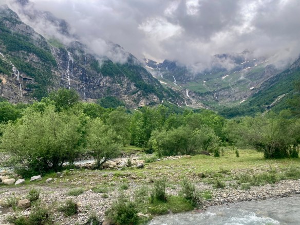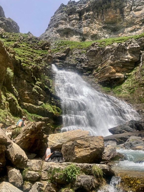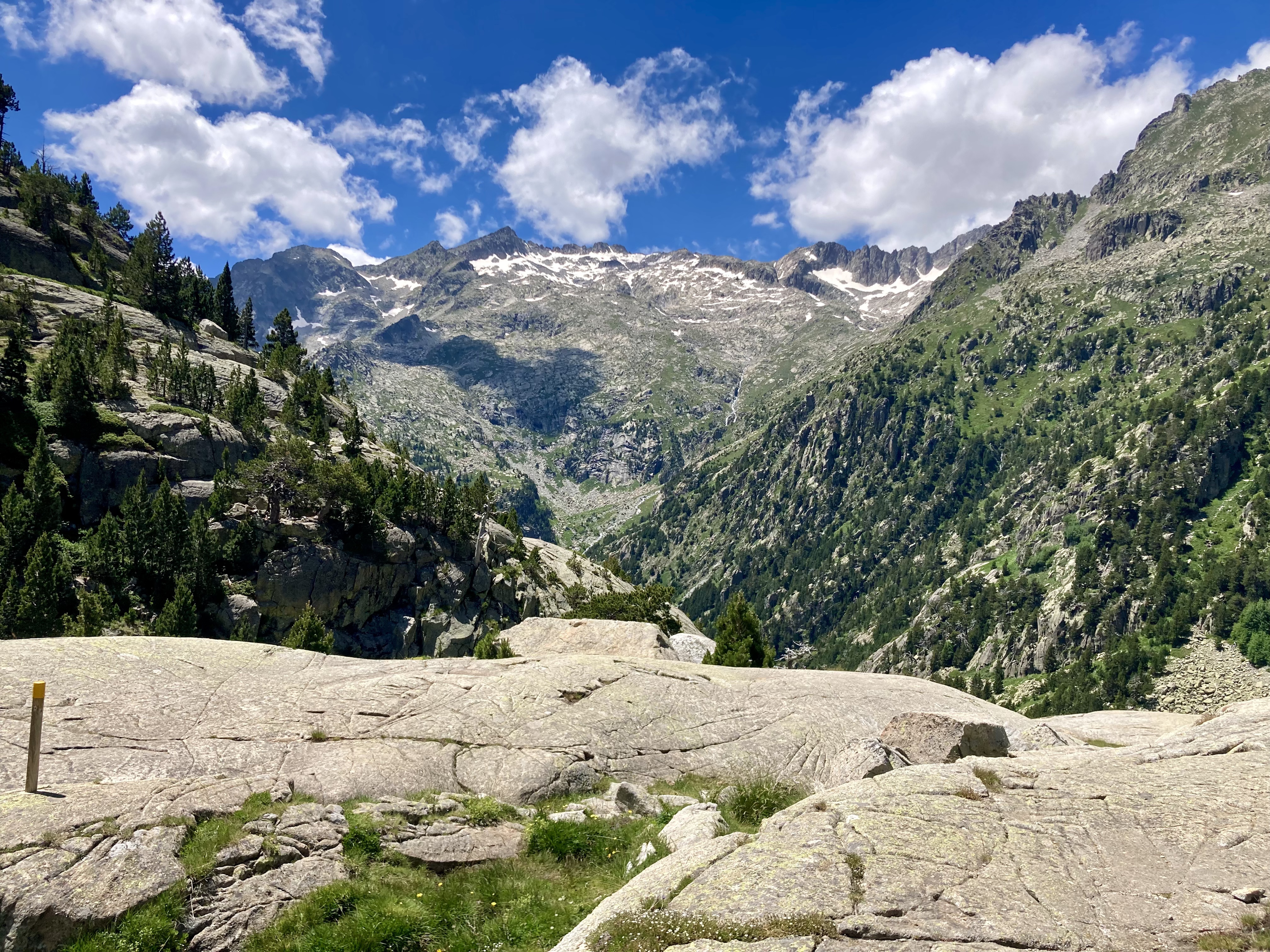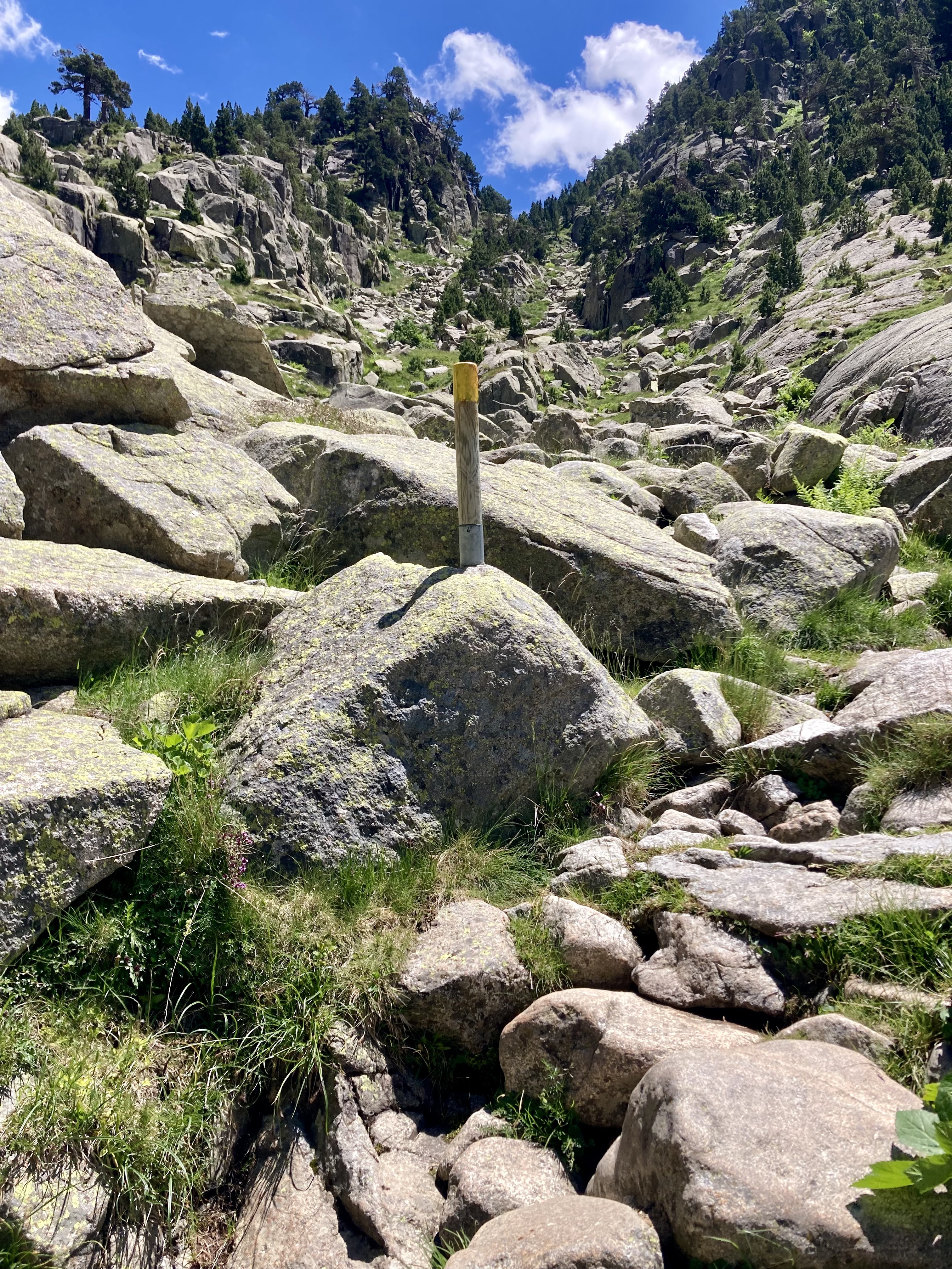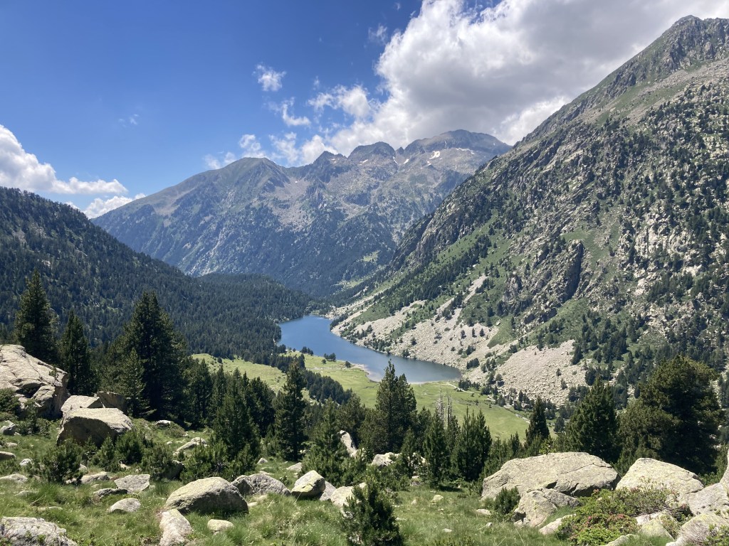 Volviendo al Planell de Aigüestortes, ayer también estuve aquí. Pero no subí en taxi, vine andando desde el parking. Son unos seis kilómetros y unos 450m de desnivel por un sendero precioso que comienza entre fresas, atravesando un bosque, y finalmente se abre al llegar al estany de la Llebreta. Después, sigue río arriba y culmina, poco antes del llano, en un encadenamiento de pequeñas cascadas con profundas pozas redondas en su base: una formación geológica que recibe el sugerente nombre de «marmitas de gigante». Me viene Jorge Manrique a la cabeza. Si un río es una vida, cada «marmita» podría ser una relación. Un aparente remanso en el que una queda «circulando» durante un tiempo hasta que la fuerza de las aguas, de la vida, de la voluntad, del frío gélido del fondo, la impulsan a la siguiente cascada, a la siguiente marmita. A veces pasamos la vida así. A veces el río se vuelve apacible. A veces hacemos algo que lo vuelve apacible.