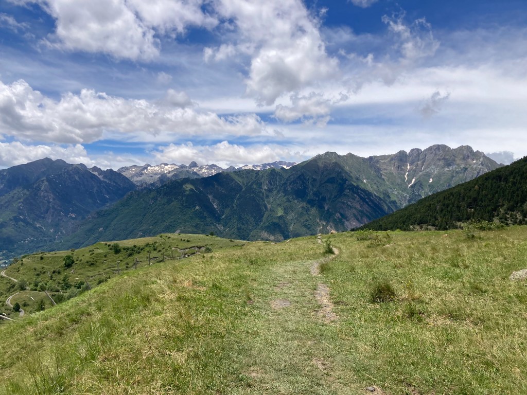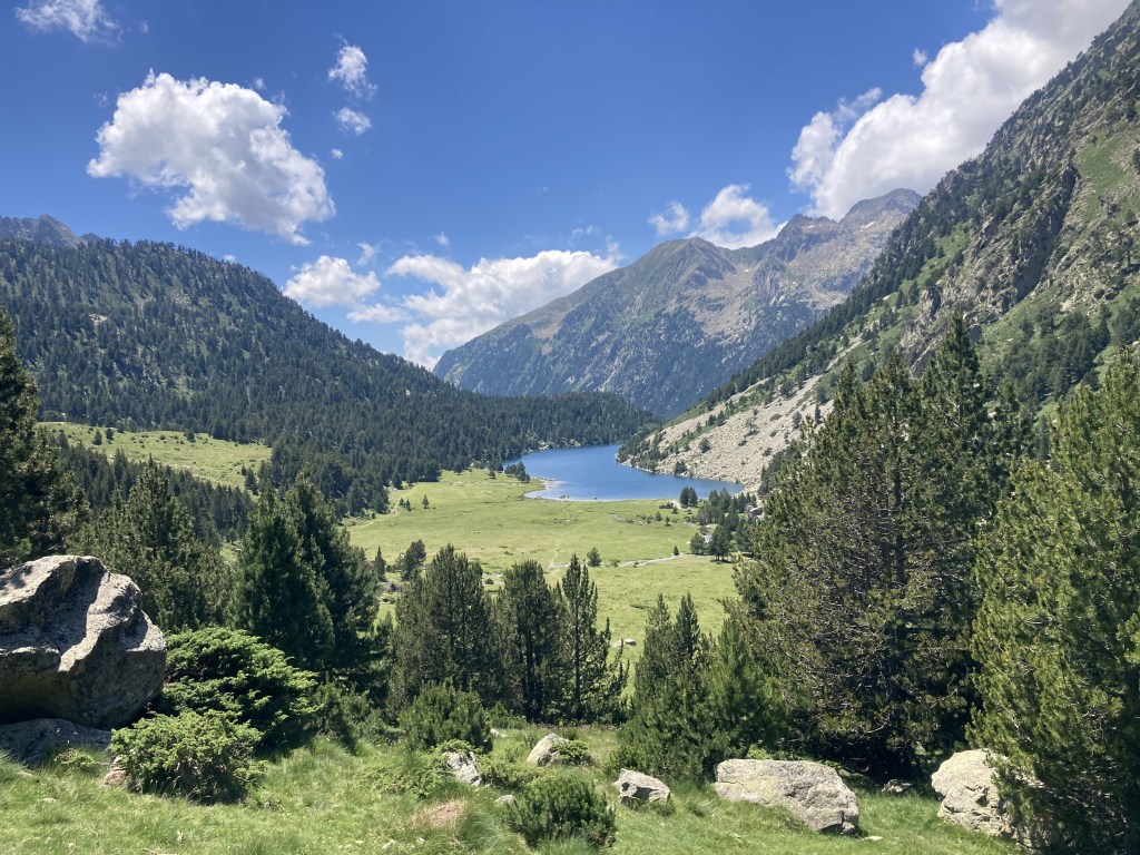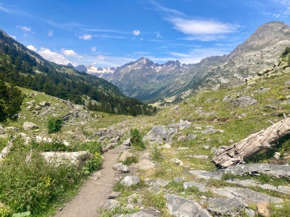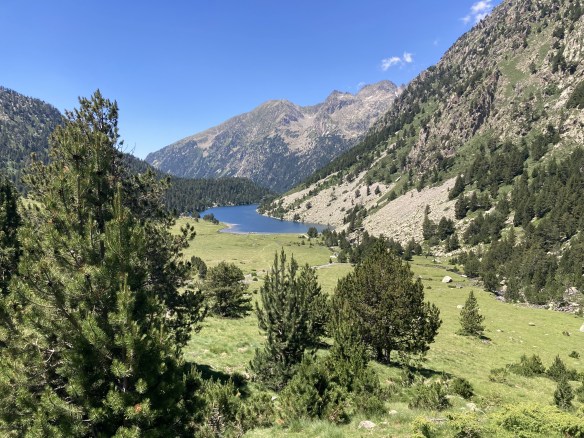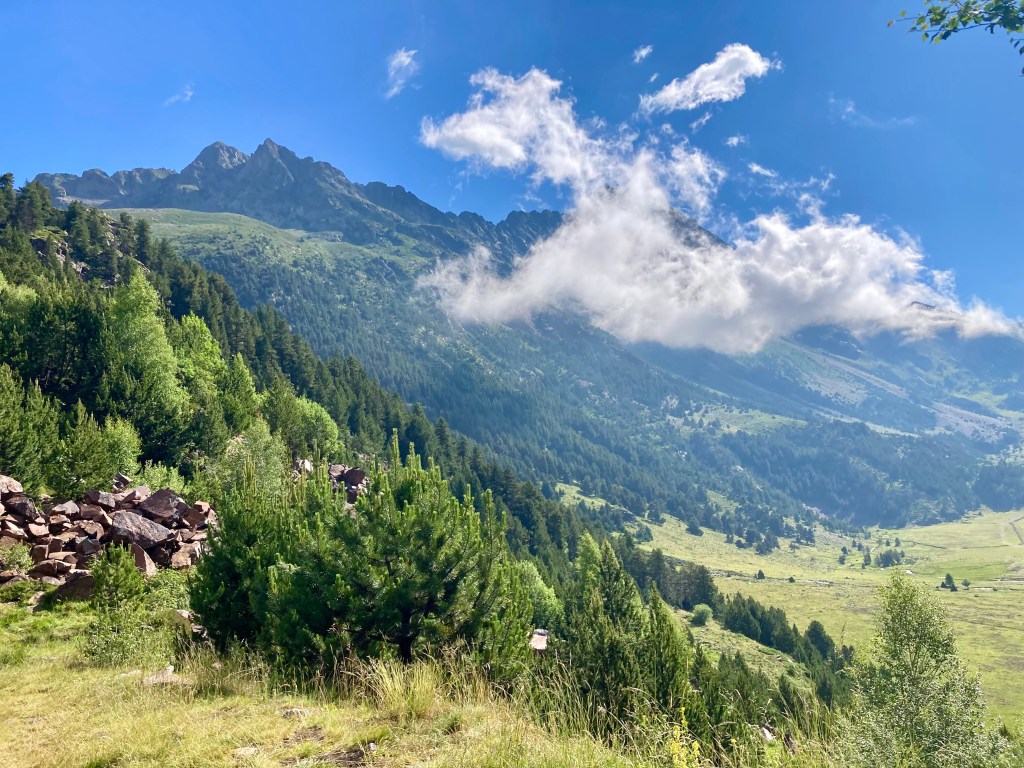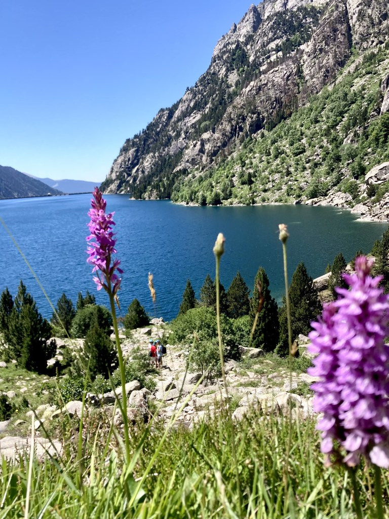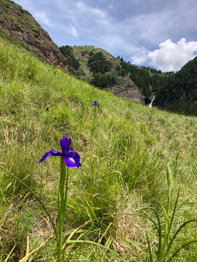 El camino hasta llegar al Estany Llong es idílico además de sencillo. Un paseo súper agradable por un pista ancha que corre paralela al rio Sant Nicolau. Es la perfecta imagen de montaña, la de los cuentos (los cuentos de nuevo): el río, el verde, las flores, las montañas… y todo ello sin apenas desnivel, lo cual, a estas alturas (a 2000 metros de altura) es más que raro. Es un paraíso que culmina en la gran masa de agua que es el Estany Llong y en la ancha llanura verde que lo rodea, donde, cómo no, pacen apaciblemente un buen puñado de vacas.