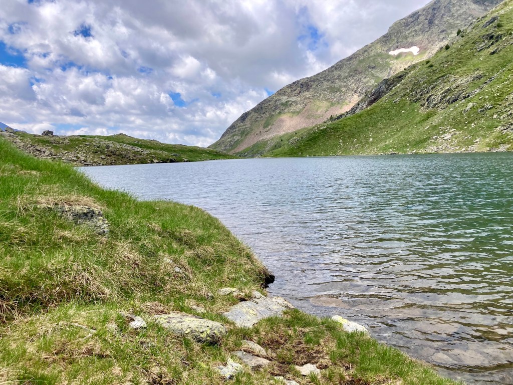 Siguiendo, ahora ya sí, por un sendero (y siguiendo corriente arriba el recorrido de las aguas), está el Estany Redó (el lago redondo, para que nos entendamos), más discreto, más elevado, más escondido, y rodeado de paredes grises tiznadas de negro. Es aquí donde paro a comer, mirando las «manadas» de peces diminutos (¿esto se llama también cardumen?). Me llama la atención cómo su movimiento apacible se vuelve a veces espasmódico, como si todo el grupo hubiera recibido alguna suerte de descarga eléctrica, o como si respondiera, rapidísima y coordinadamente, a las instrucciones de una directora de orquesta invisible.