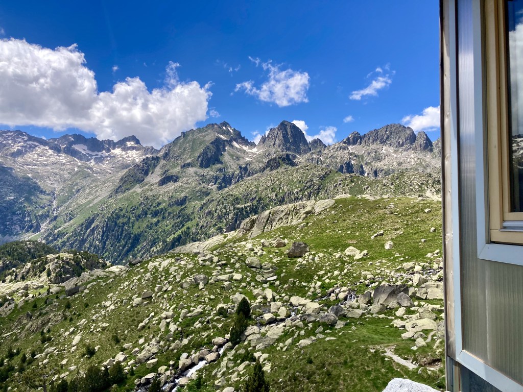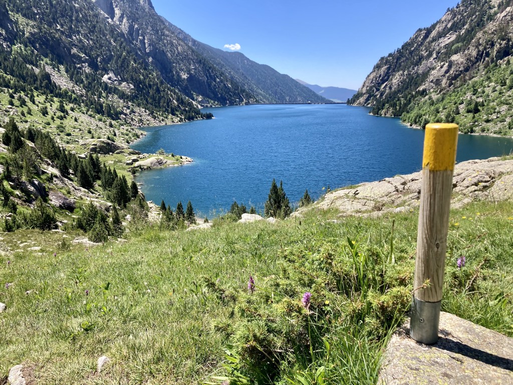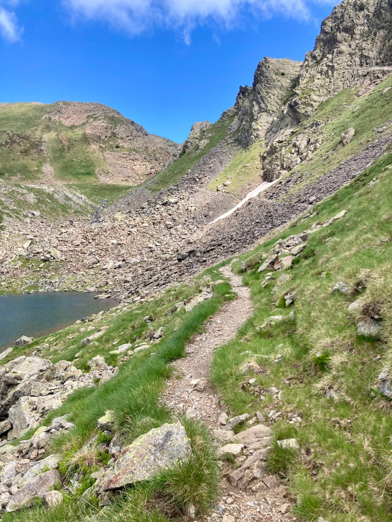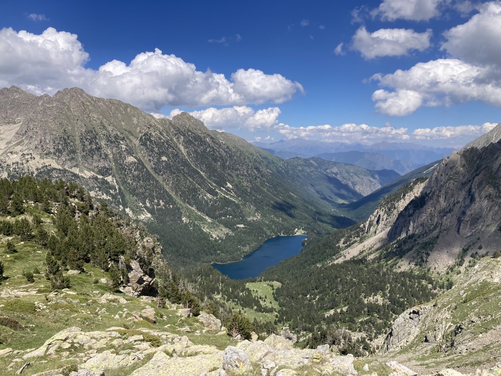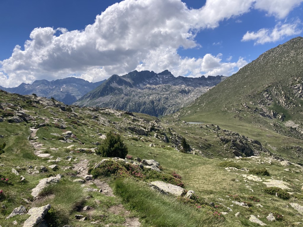 La subida al Portarró d’Espot no se me hace especialmente dura. Lo más bonito es ir viendo cómo cambia la vista del lago, de los lagos, conforme subo. Es un puerto amplio y hay que acercarse al mirador (otros quince minutos andando) para poder asomarse al otro lado. Me gusta verlo porque, al contrario que esta parte del Parque, aquello sí lo conozco: Sant Maurici, el Port de Amitges… Y ver ya también desde aquí montañas más lejanas, las de la frontera andorrana, con la Pica d’Estats a la cabeza.