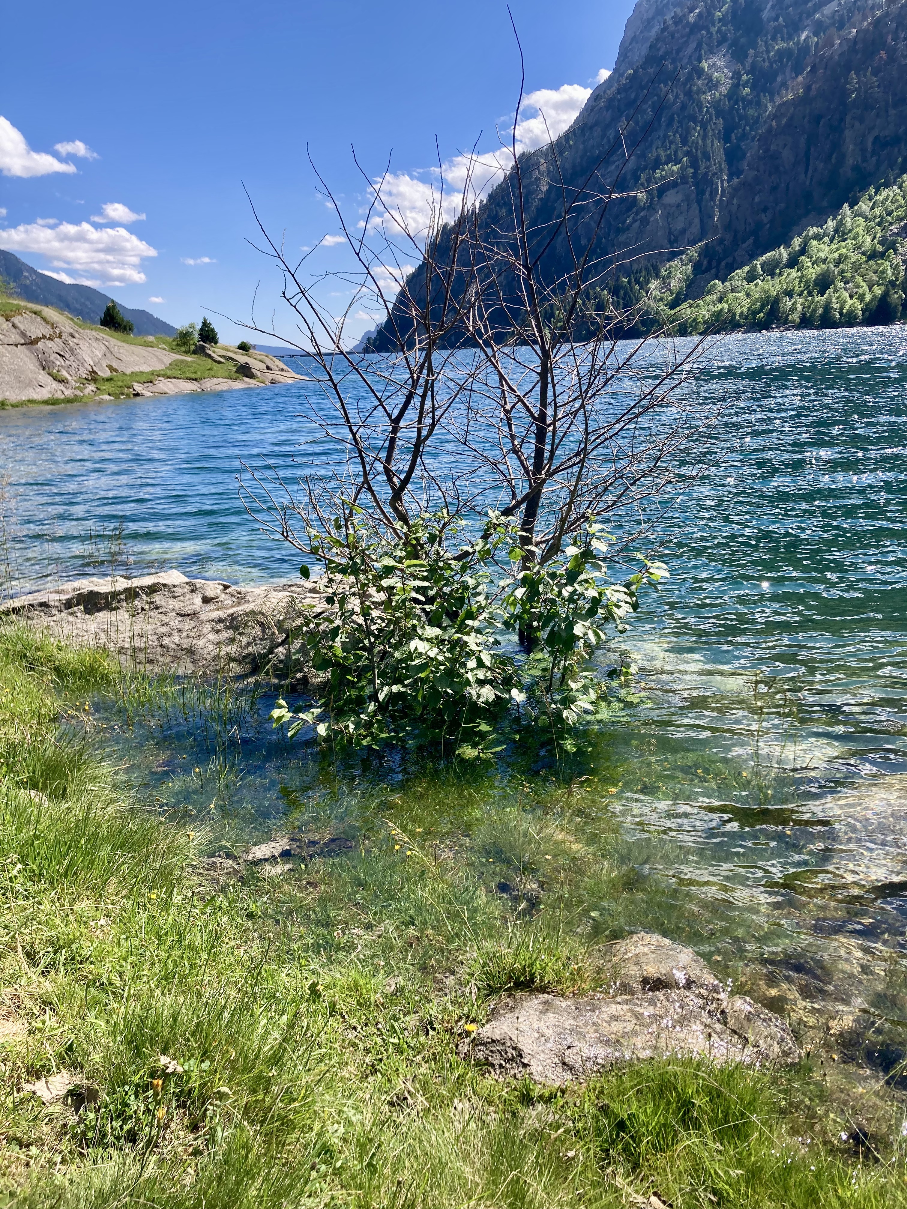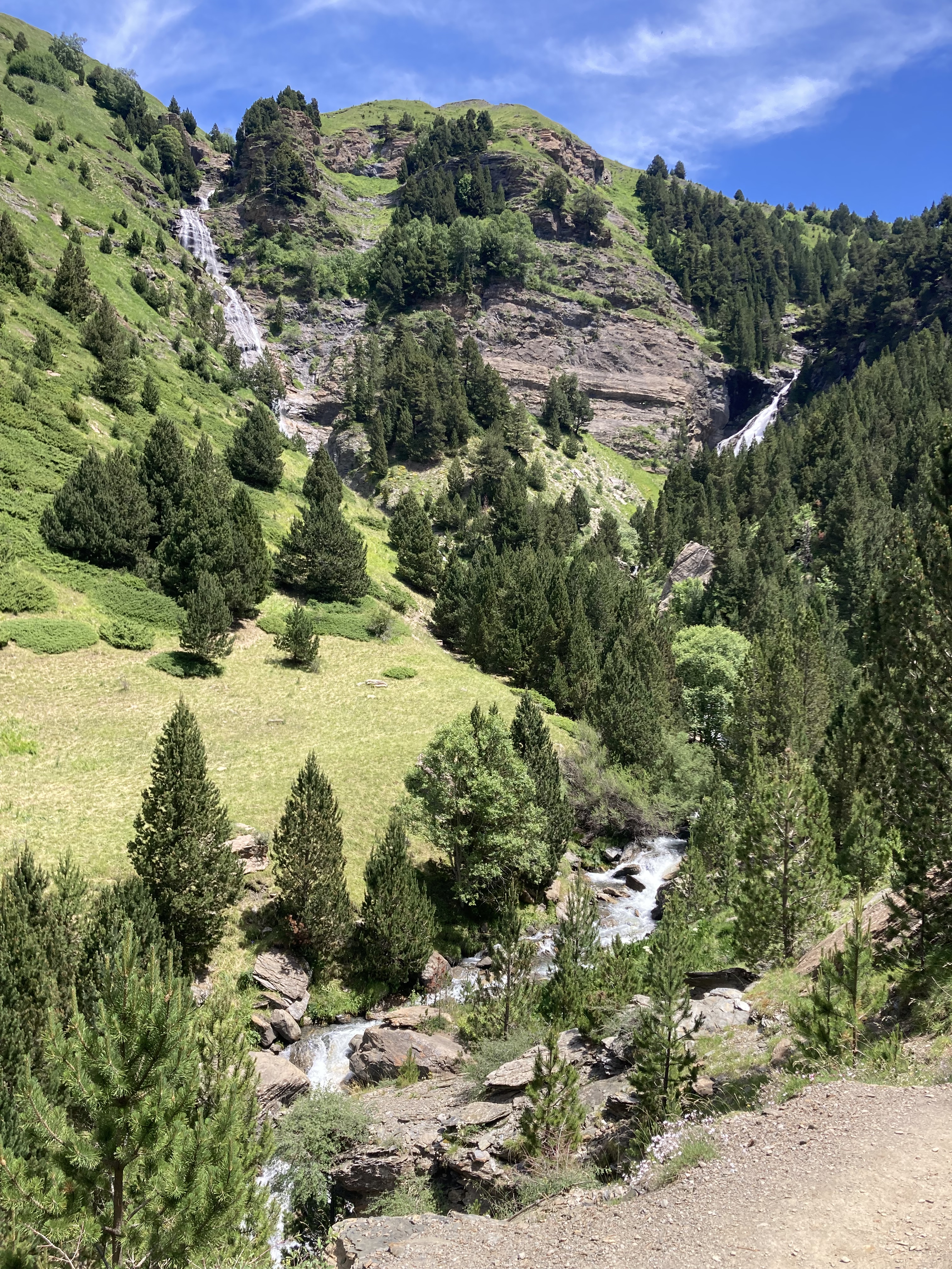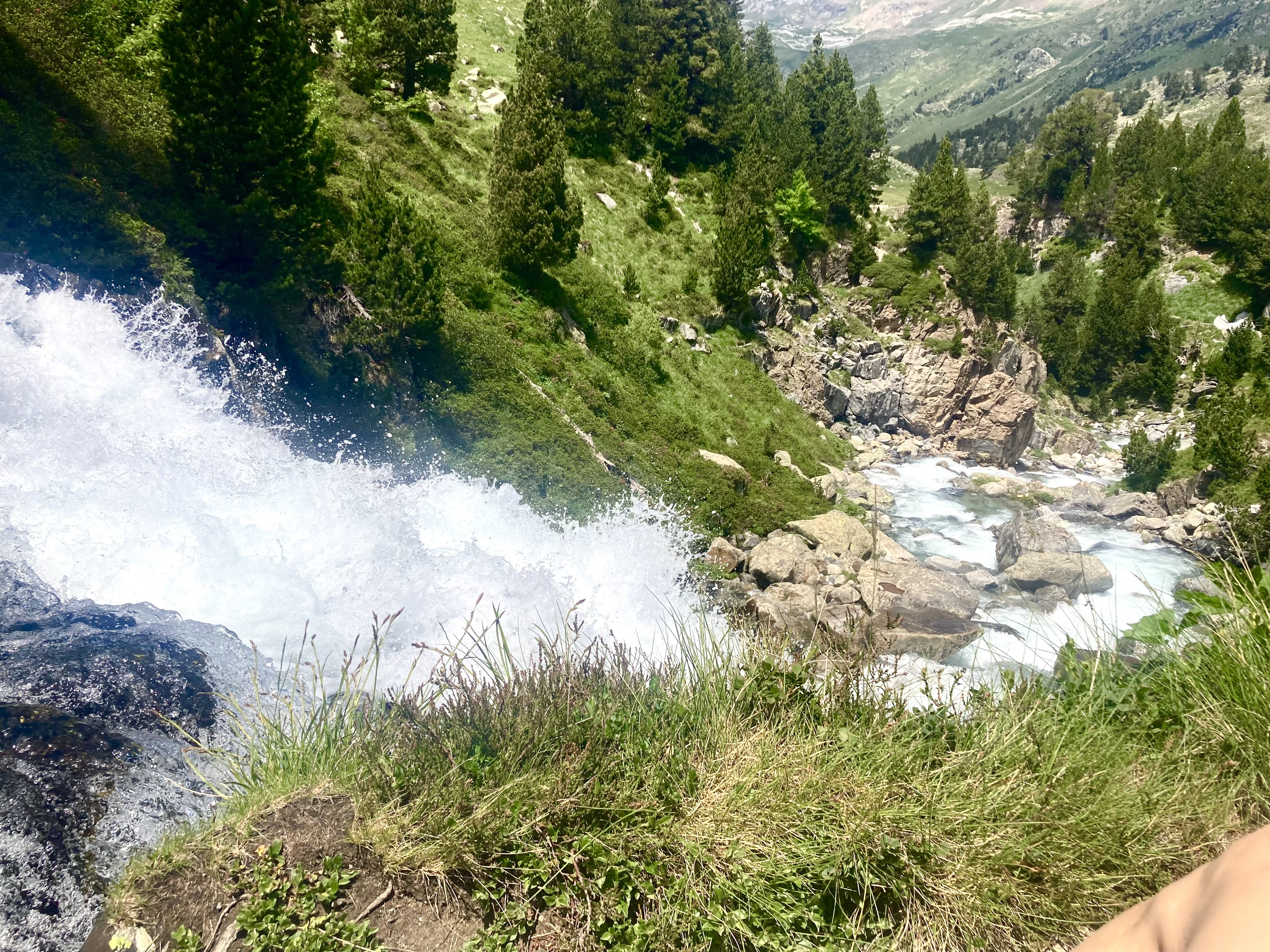 Volviendo al Planell de Aigüestortes, ayer también estuve aquí. Pero no subí en taxi, vine andando desde el parking. Son unos seis kilómetros y unos 450m de desnivel por un sendero precioso que comienza entre fresas, atravesando un bosque, y finalmente se abre al llegar al estany de la Llebreta. Después, sigue río arriba y culmina, poco antes del llano, en un encadenamiento de pequeñas cascadas con profundas pozas redondas en su base: una formación geológica que recibe el sugerente nombre de «marmitas de gigante». Me viene Jorge Manrique a la cabeza. Si un río es una vida, cada «marmita» podría ser una relación. Un aparente remanso en el que una queda «circulando» durante un tiempo hasta que la fuerza de las aguas, de la vida, de la voluntad, del frío gélido del fondo, la impulsan a la siguiente cascada, a la siguiente marmita. A veces pasamos la vida así. A veces el río se vuelve apacible. A veces hacemos algo que lo vuelve apacible.
