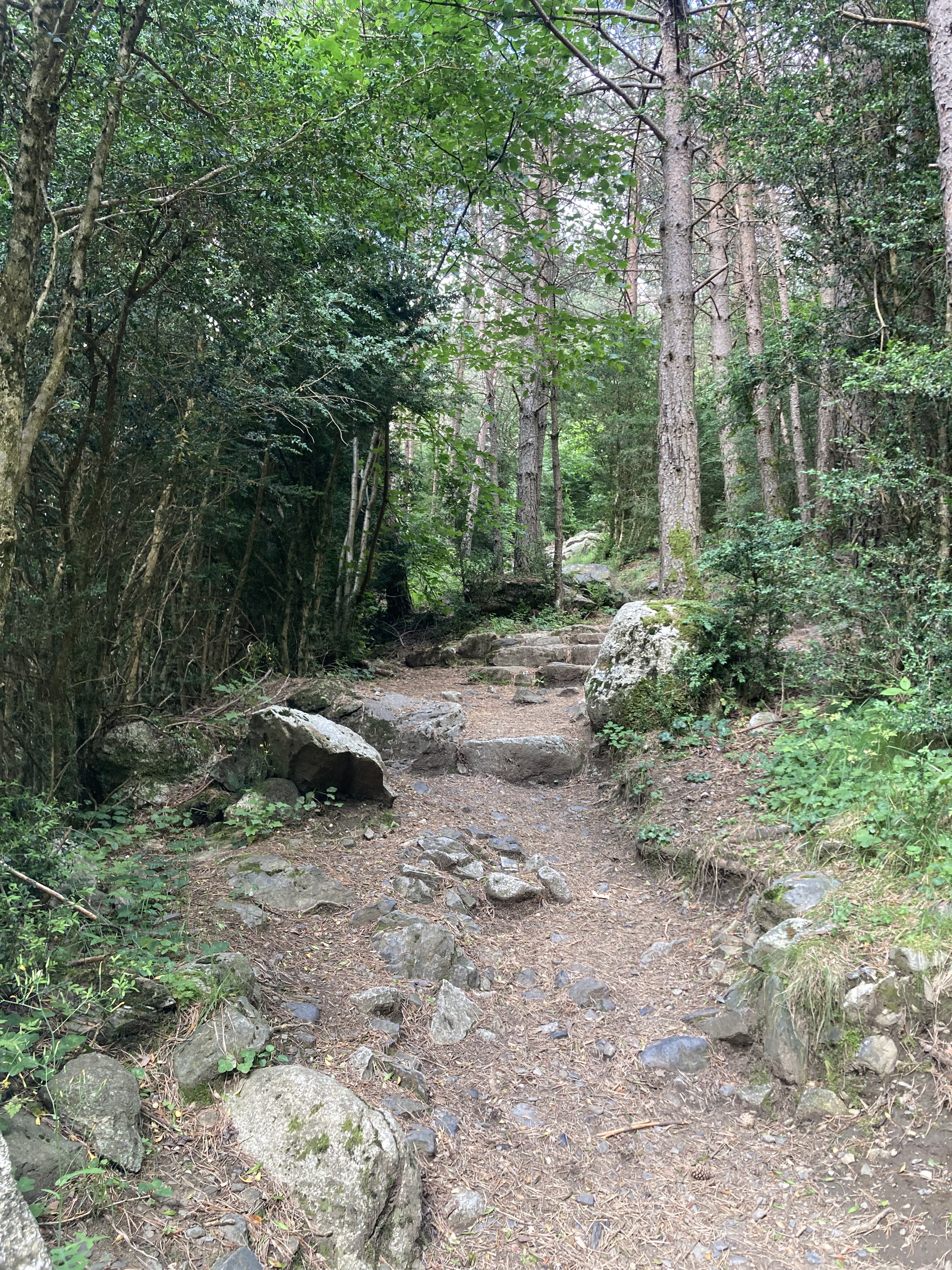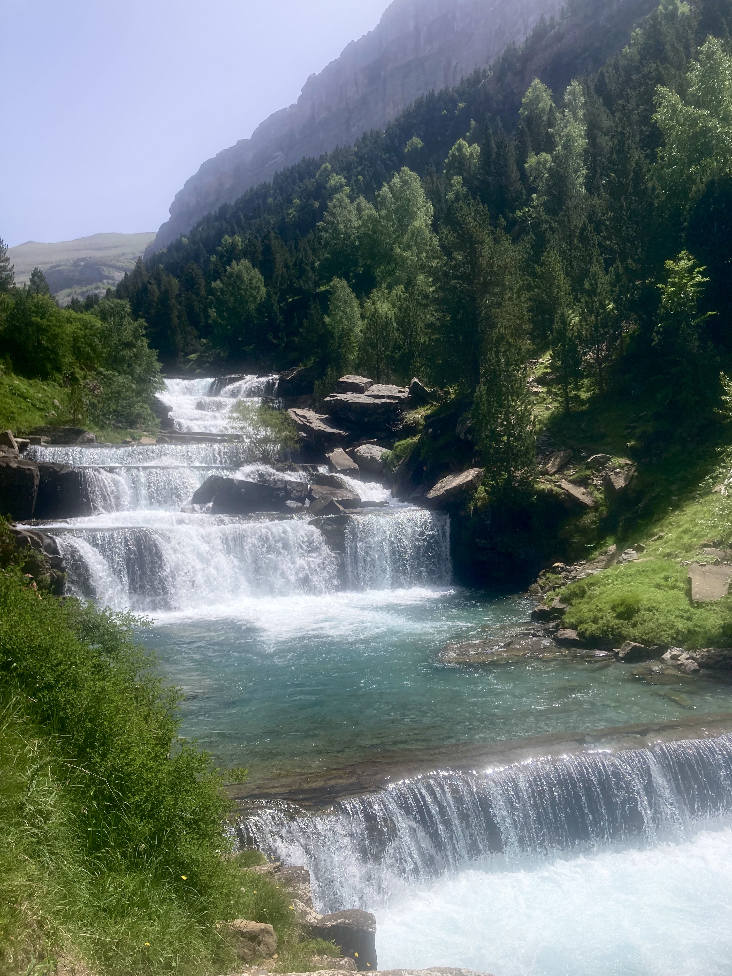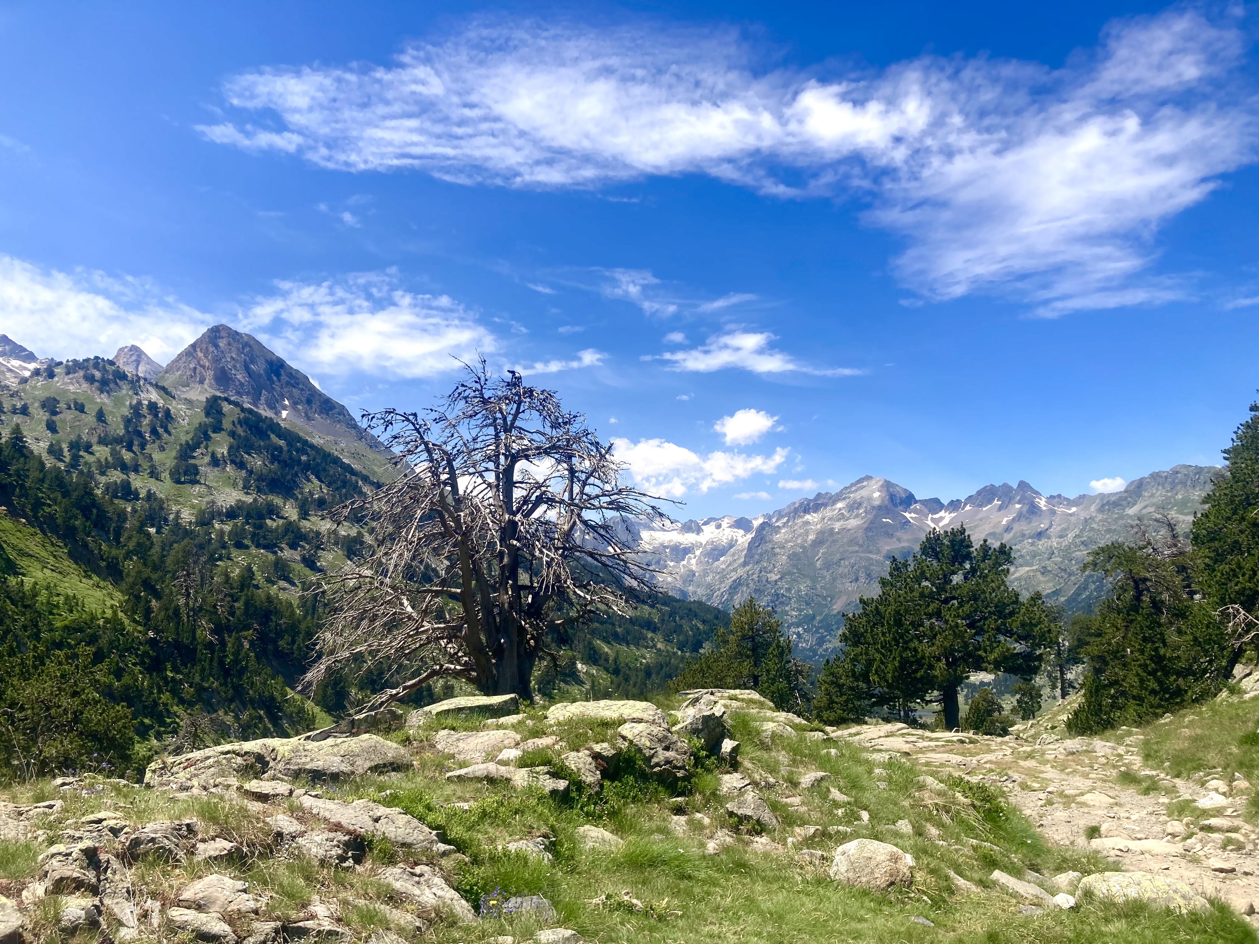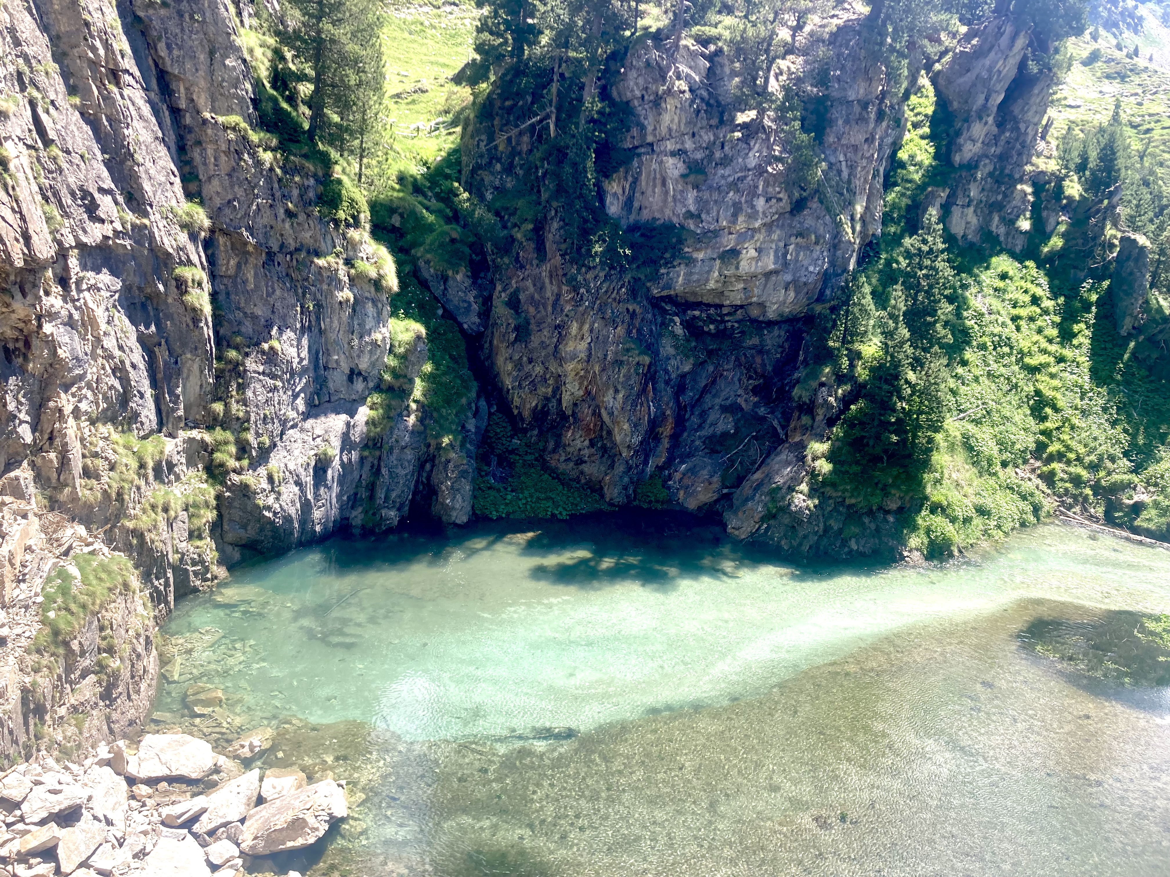 Volviendo al Planell de Aigüestortes, ayer también estuve aquí. Pero no subí en taxi, vine andando desde el parking. Son unos seis kilómetros y unos 450m de desnivel por un sendero precioso que comienza entre fresas, atravesando un bosque, y finalmente se abre al llegar al estany de la Llebreta. Después, sigue río arriba y culmina, poco antes del llano, en un encadenamiento de pequeñas cascadas con profundas pozas redondas en su base: una formación geológica que recibe el sugerente nombre de «marmitas de gigante». Me viene Jorge Manrique a la cabeza. Si un río es una vida, cada «marmita» podría ser una relación. Un aparente remanso en el que una queda «circulando» durante un tiempo hasta que la fuerza de las aguas, de la vida, de la voluntad, del frío gélido del fondo, la impulsan a la siguiente cascada, a la siguiente marmita. A veces pasamos la vida así. A veces el río se vuelve apacible. A veces hacemos algo que lo vuelve apacible.