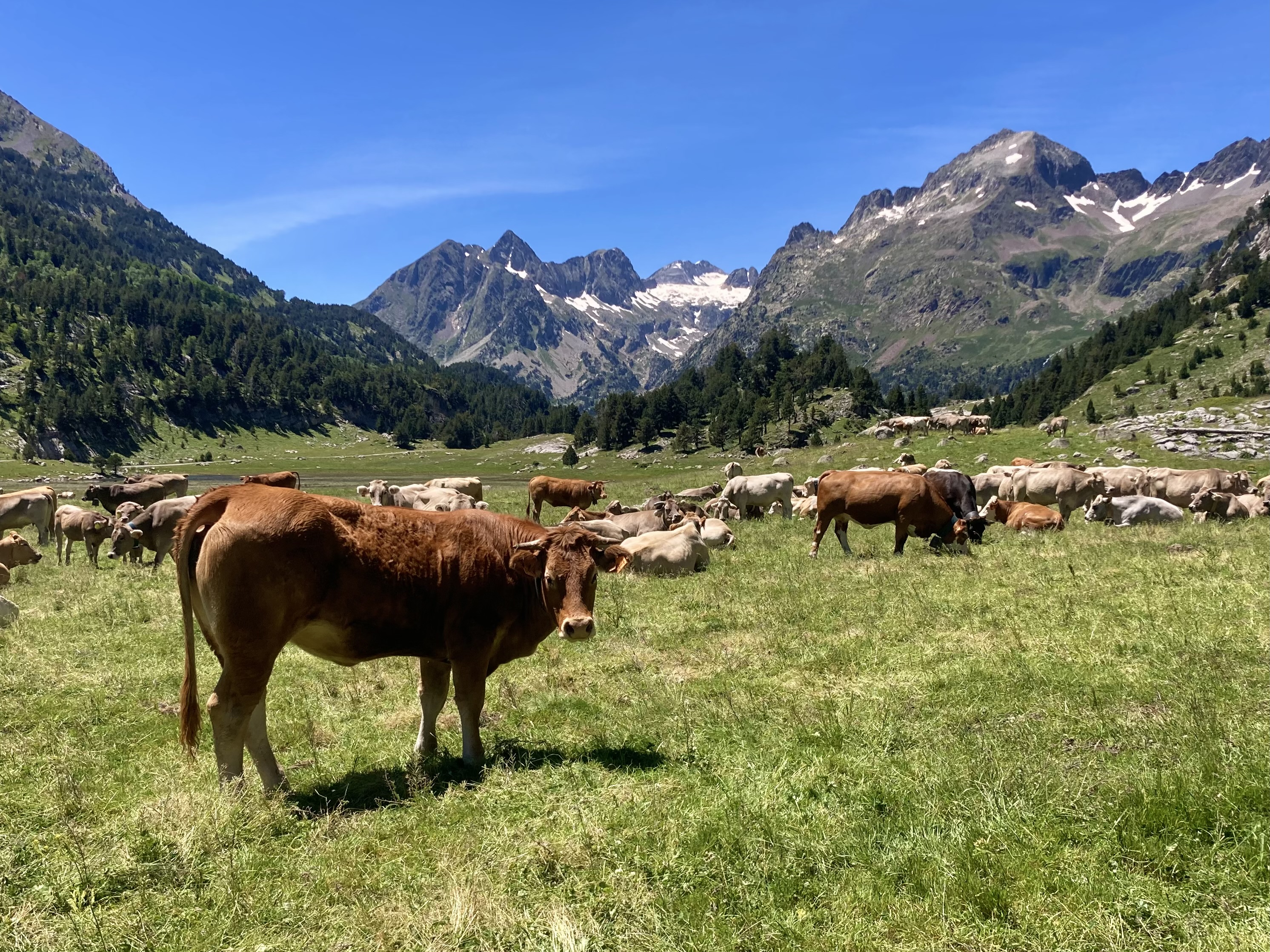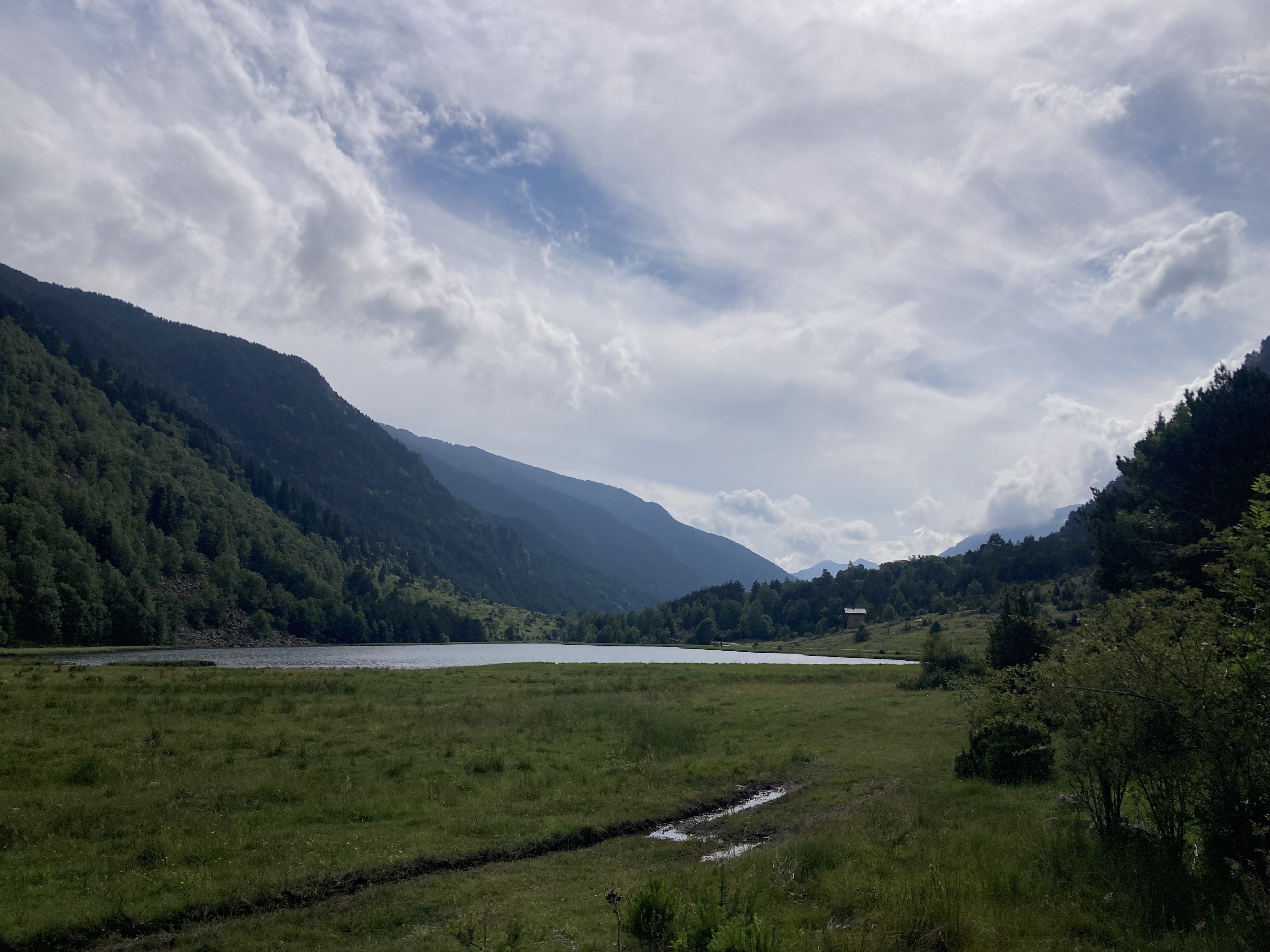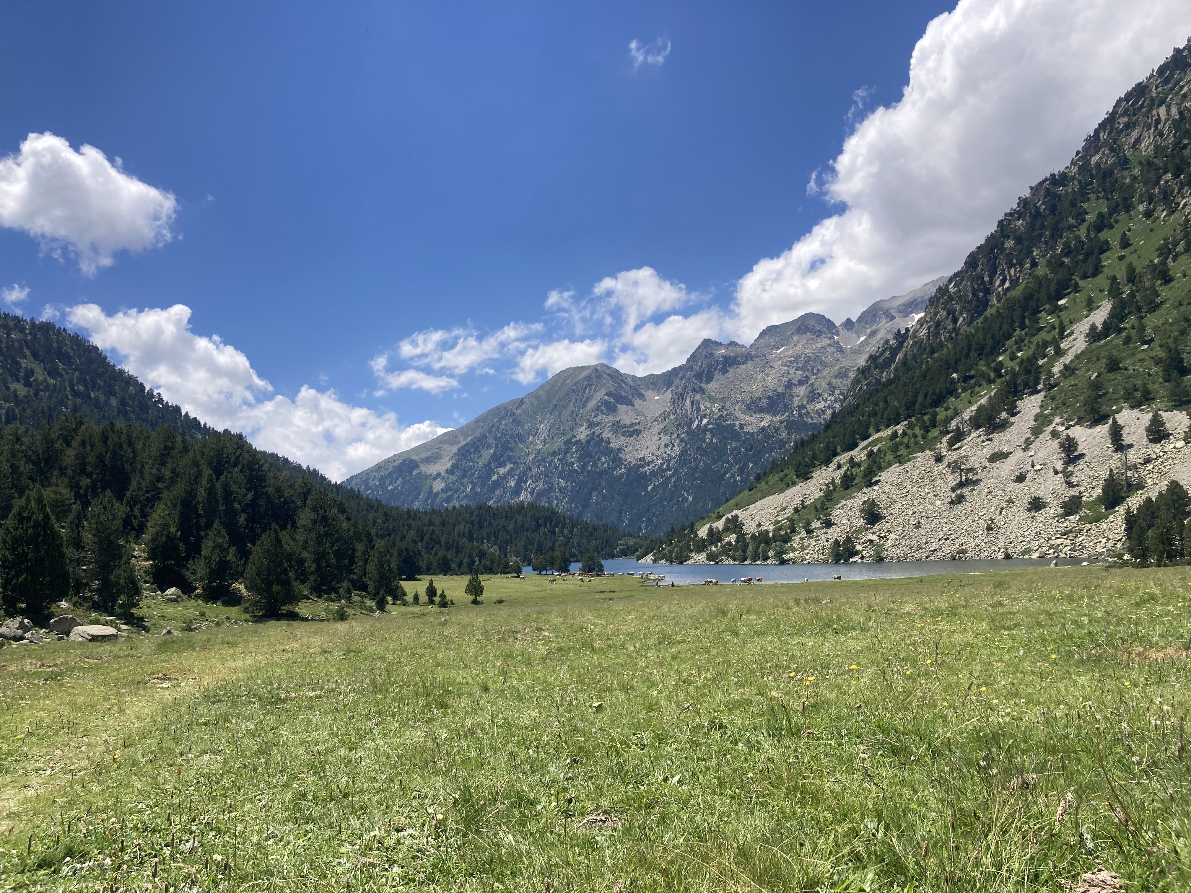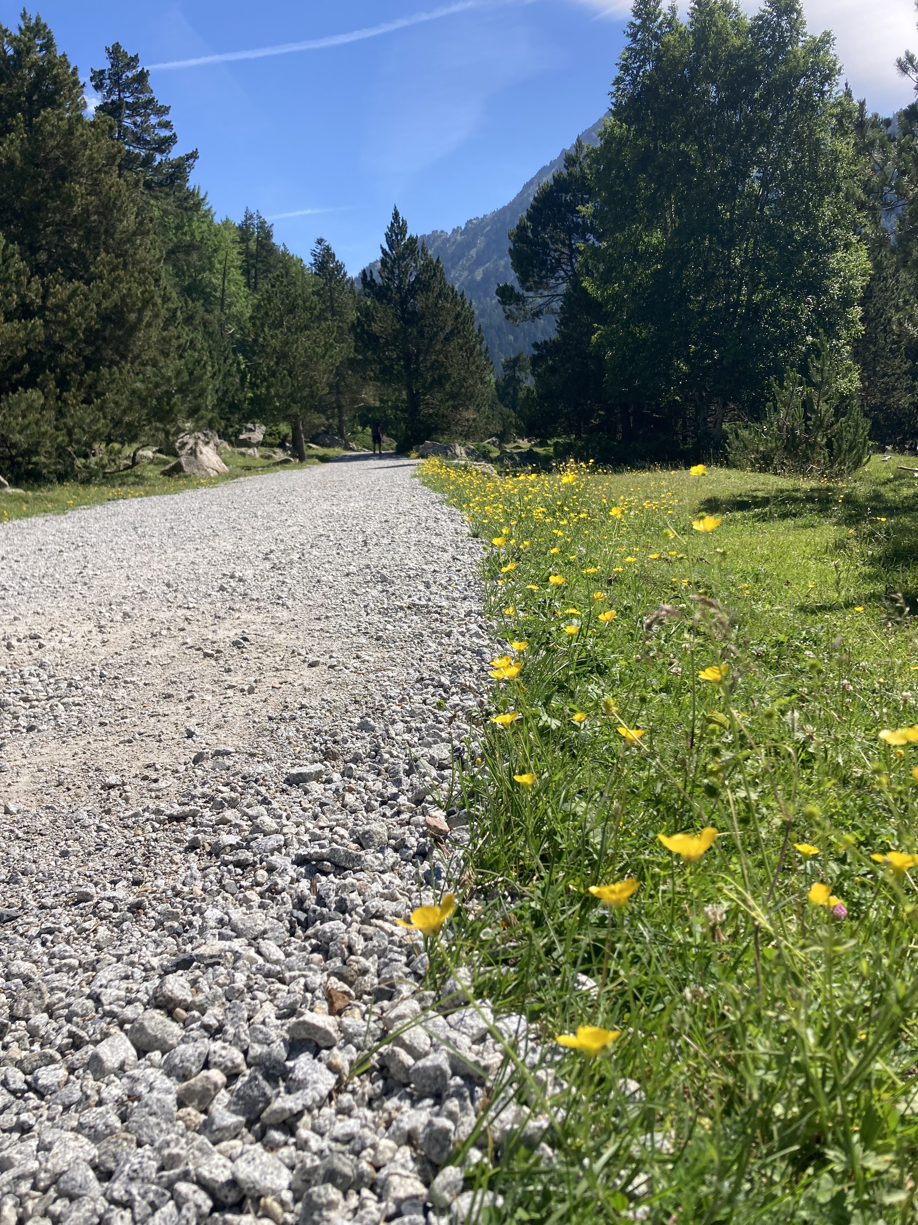 El camino hasta llegar al Estany Llong es idílico además de sencillo. Un paseo súper agradable por un pista ancha que corre paralela al rio Sant Nicolau. Es la perfecta imagen de montaña, la de los cuentos (los cuentos de nuevo): el río, el verde, las flores, las montañas… y todo ello sin apenas desnivel, lo cual, a estas alturas (a 2000 metros de altura) es más que raro. Es un paraíso que culmina en la gran masa de agua que es el Estany Llong y en la ancha llanura verde que lo rodea, donde, cómo no, pacen apaciblemente un buen puñado de vacas.