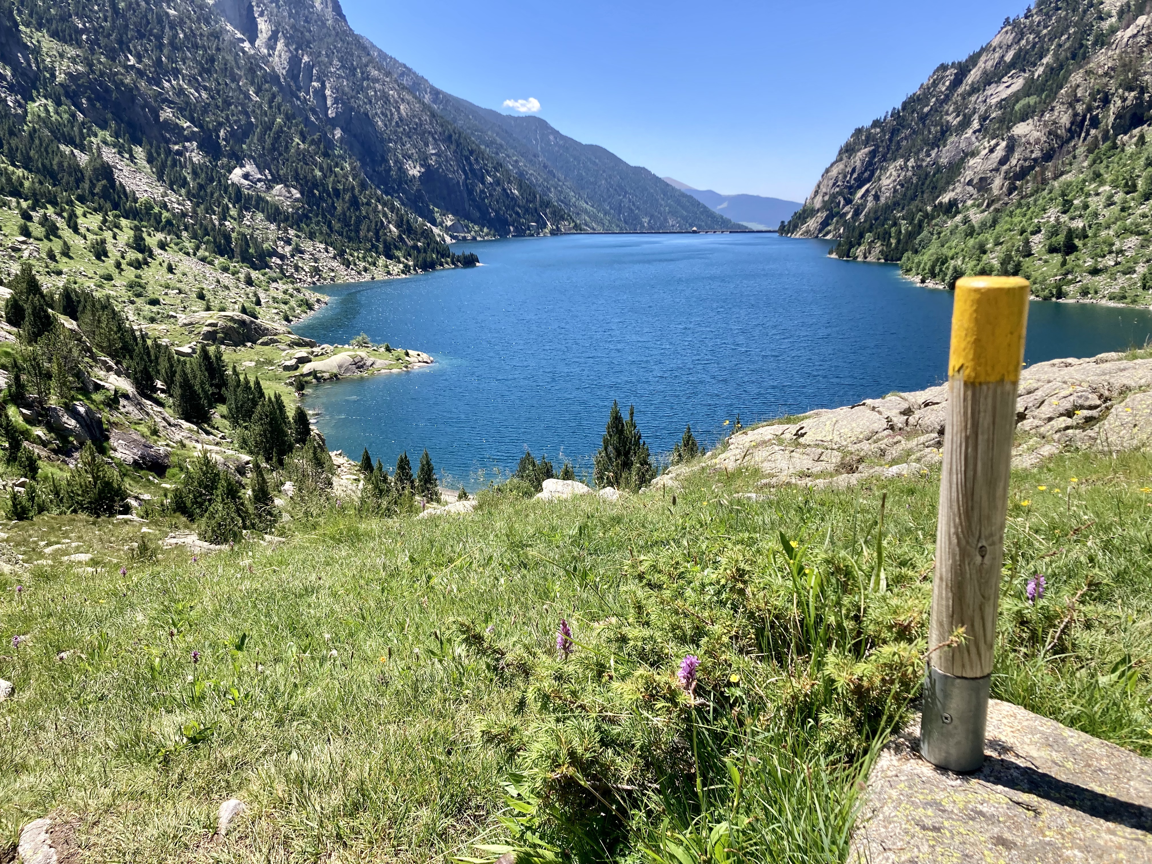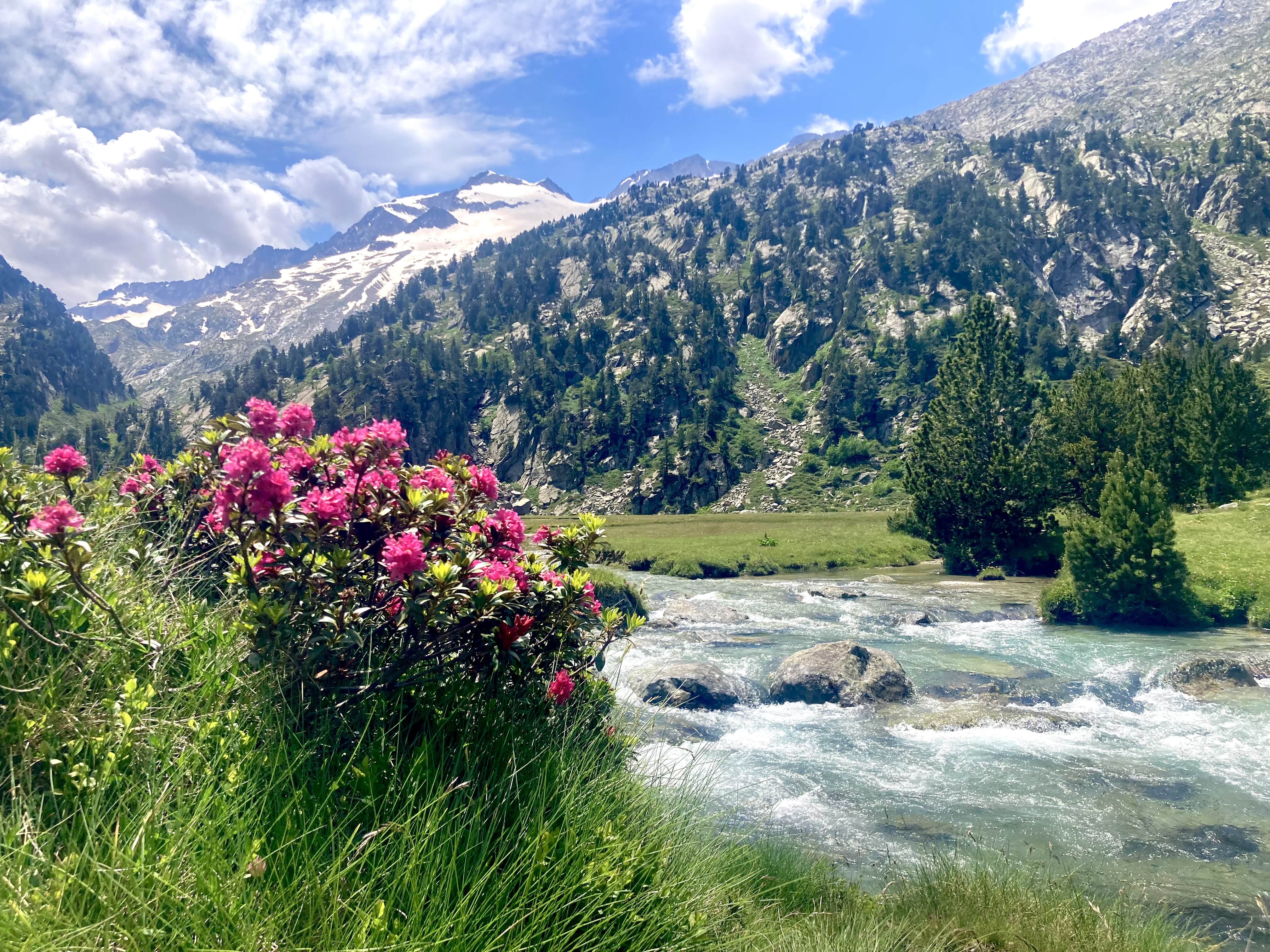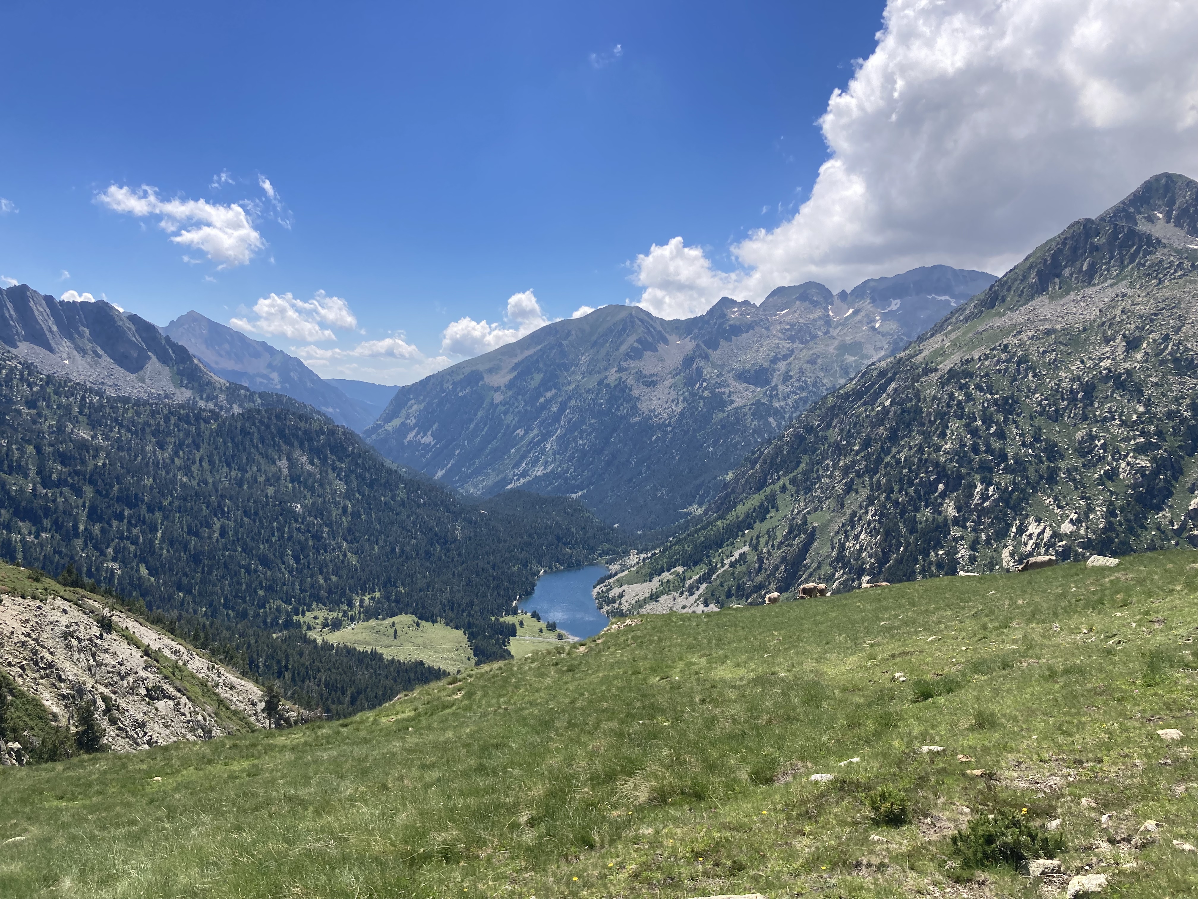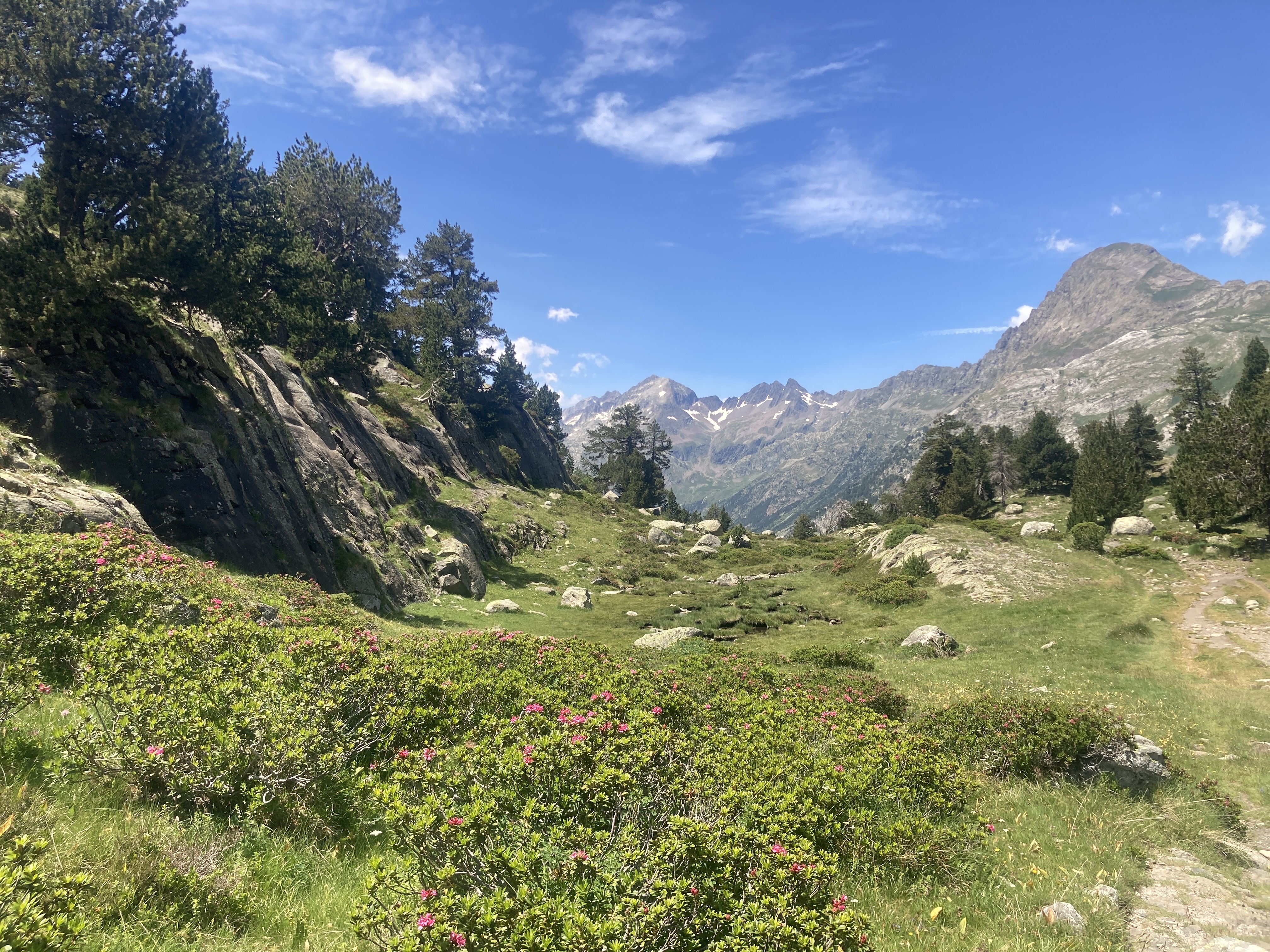 El camino hasta llegar al Estany Llong es idílico además de sencillo. Un paseo súper agradable por un pista ancha que corre paralela al rio Sant Nicolau. Es la perfecta imagen de montaña, la de los cuentos (los cuentos de nuevo): el río, el verde, las flores, las montañas… y todo ello sin apenas desnivel, lo cual, a estas alturas (a 2000 metros de altura) es más que raro. Es un paraíso que culmina en la gran masa de agua que es el Estany Llong y en la ancha llanura verde que lo rodea, donde, cómo no, pacen apaciblemente un buen puñado de vacas.