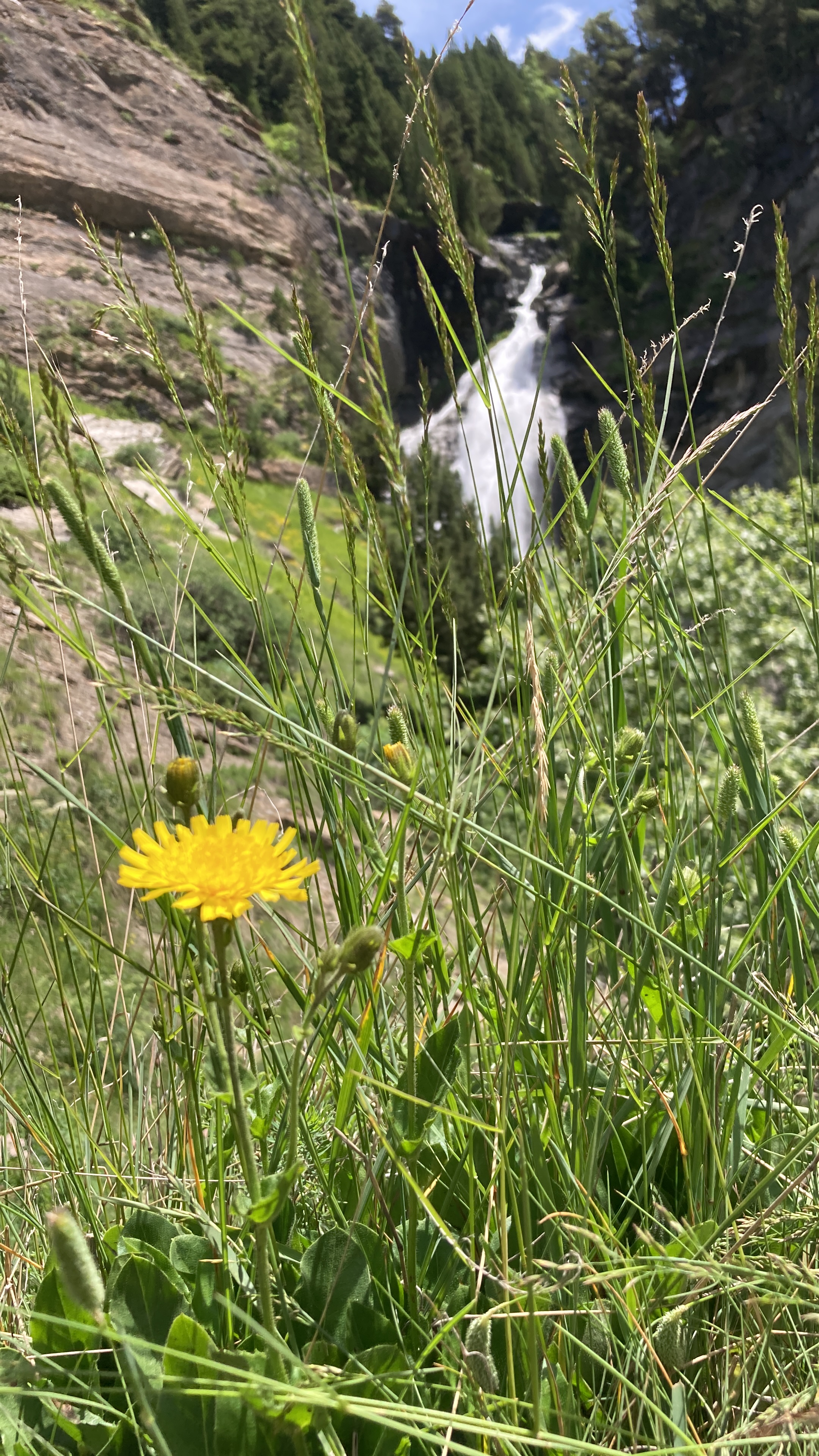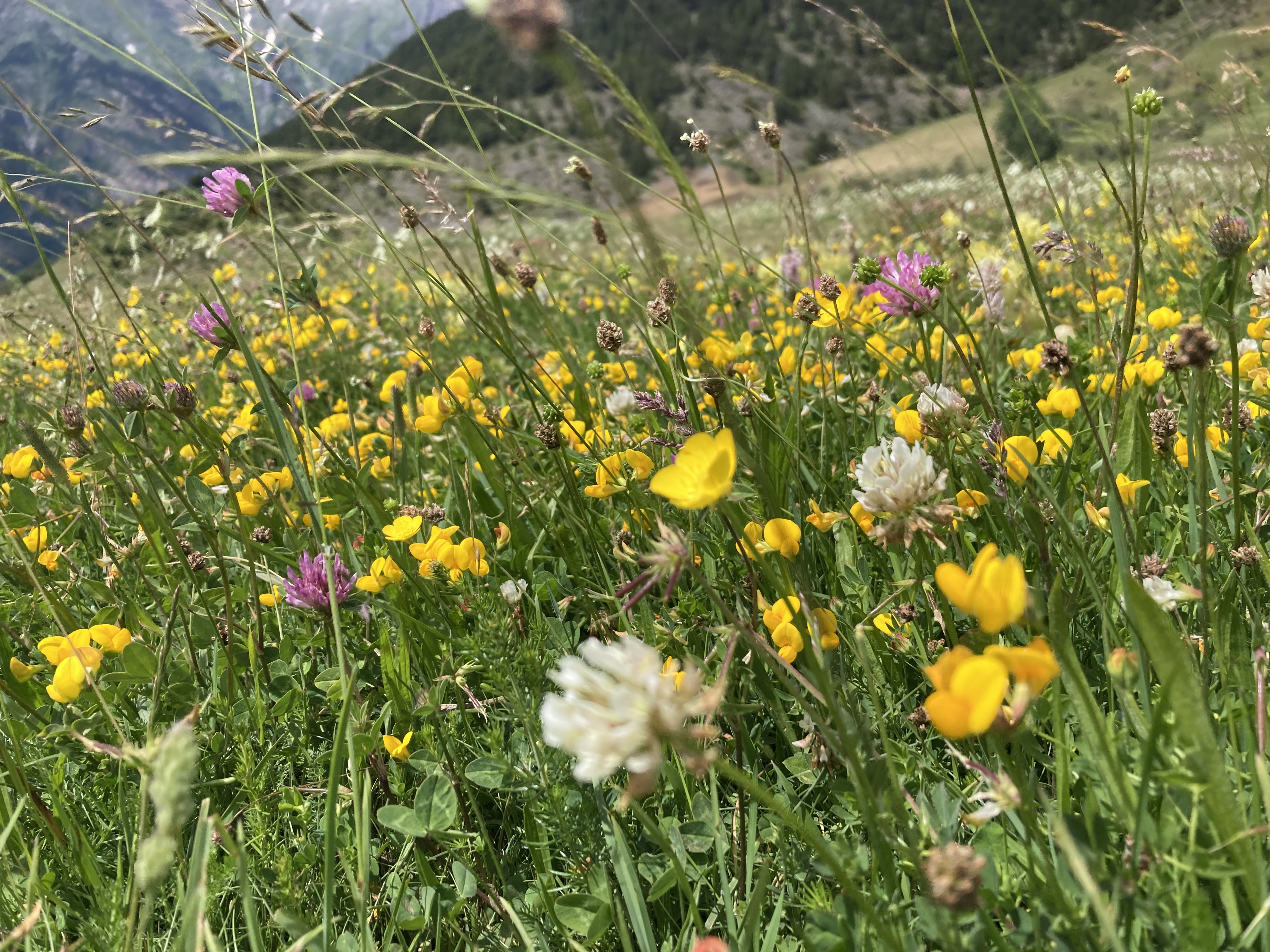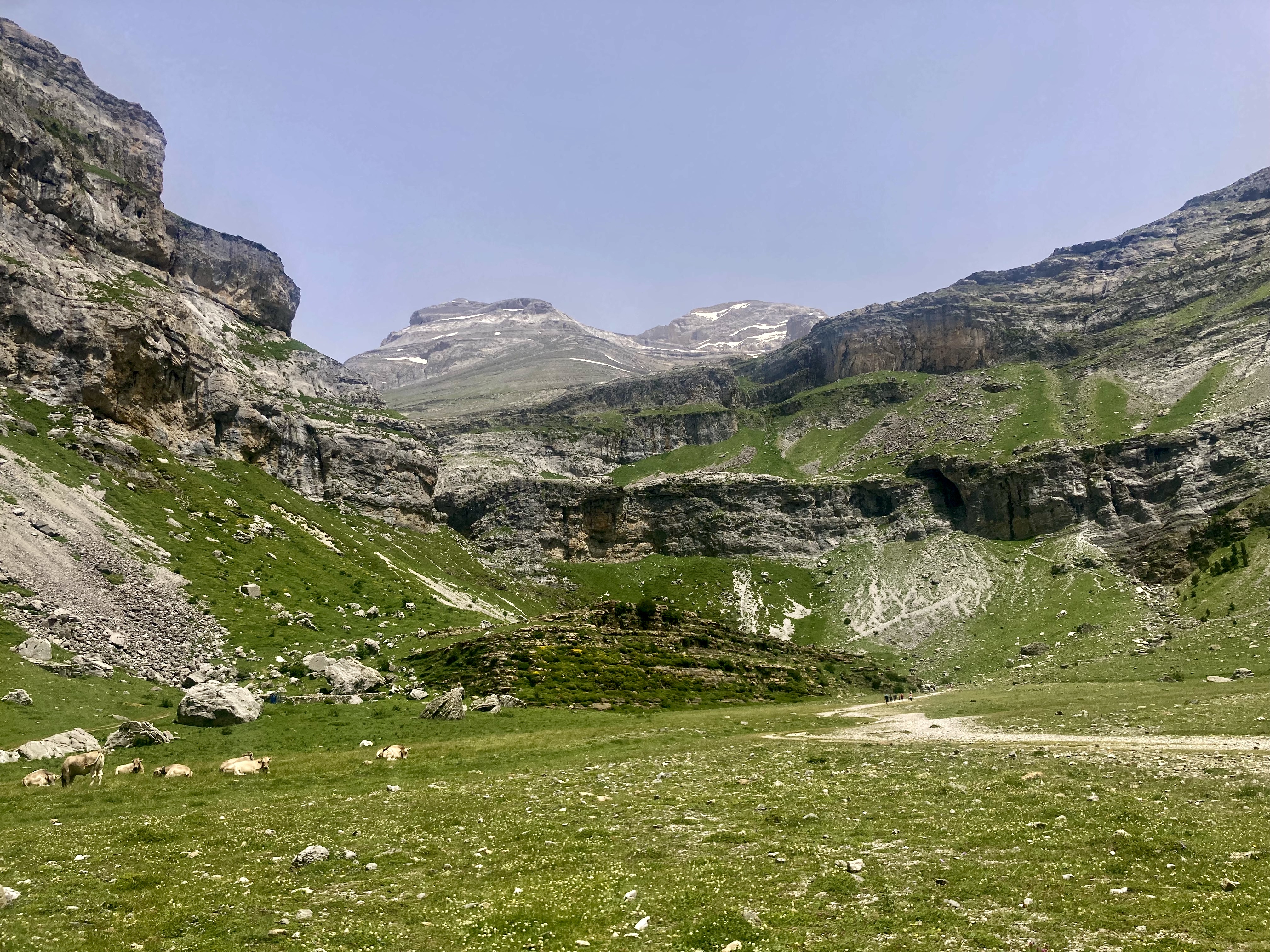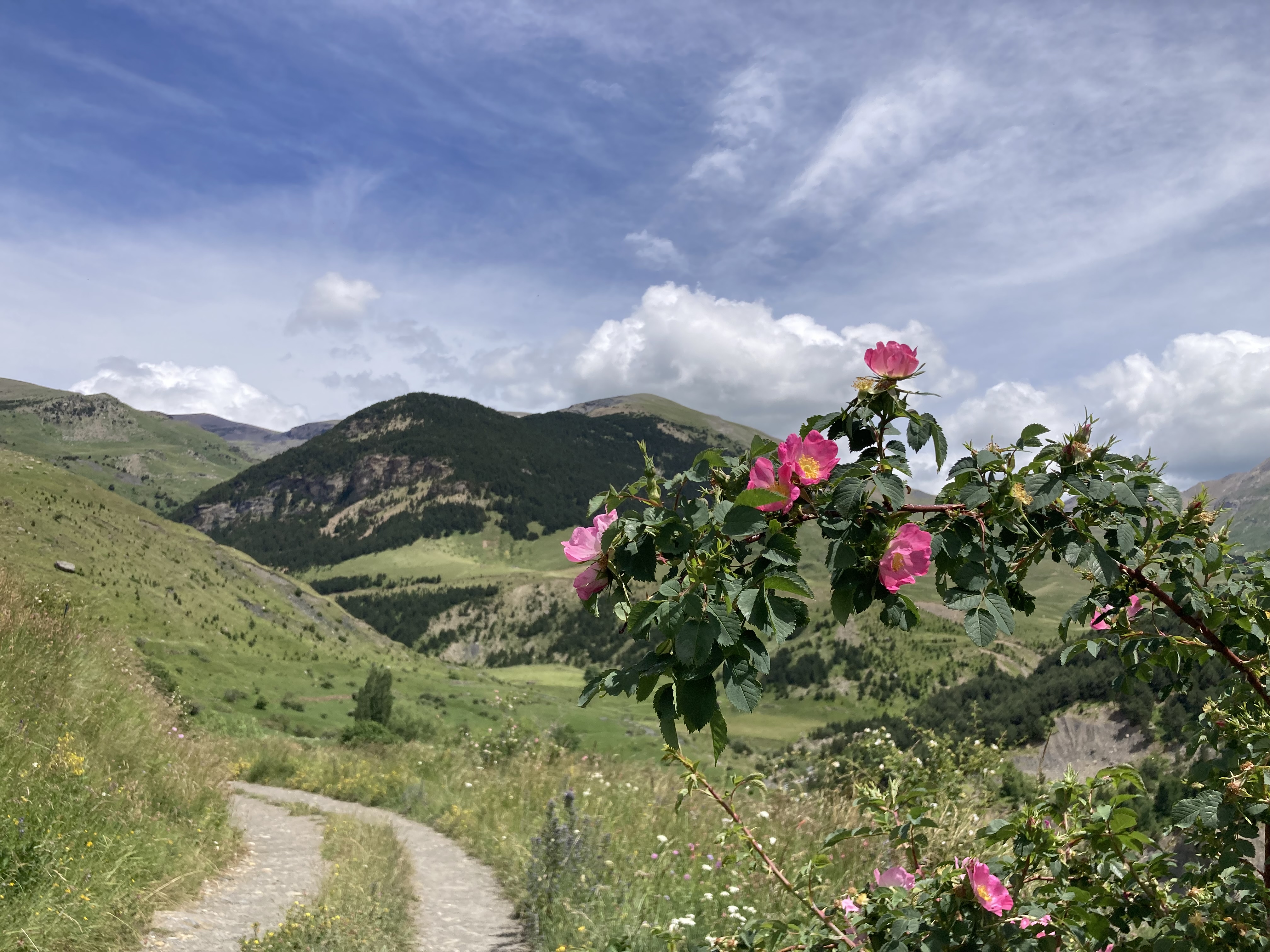El camino hasta llegar al Estany Llong es idílico además de sencillo. Un paseo súper agradable por un pista ancha que corre paralela al rio Sant Nicolau. Es la perfecta imagen de montaña, la de los cuentos (los cuentos de nuevo): el río, el verde, las flores, las montañas… y todo ello sin apenas desnivel, lo cual, a estas alturas (a 2000 metros de altura) es más que raro. Es un paraíso que culmina en la gran masa de agua que es el Estany Llong y en la ancha llanura verde que lo rodea, donde, cómo no, pacen apaciblemente un buen puñado de vacas.