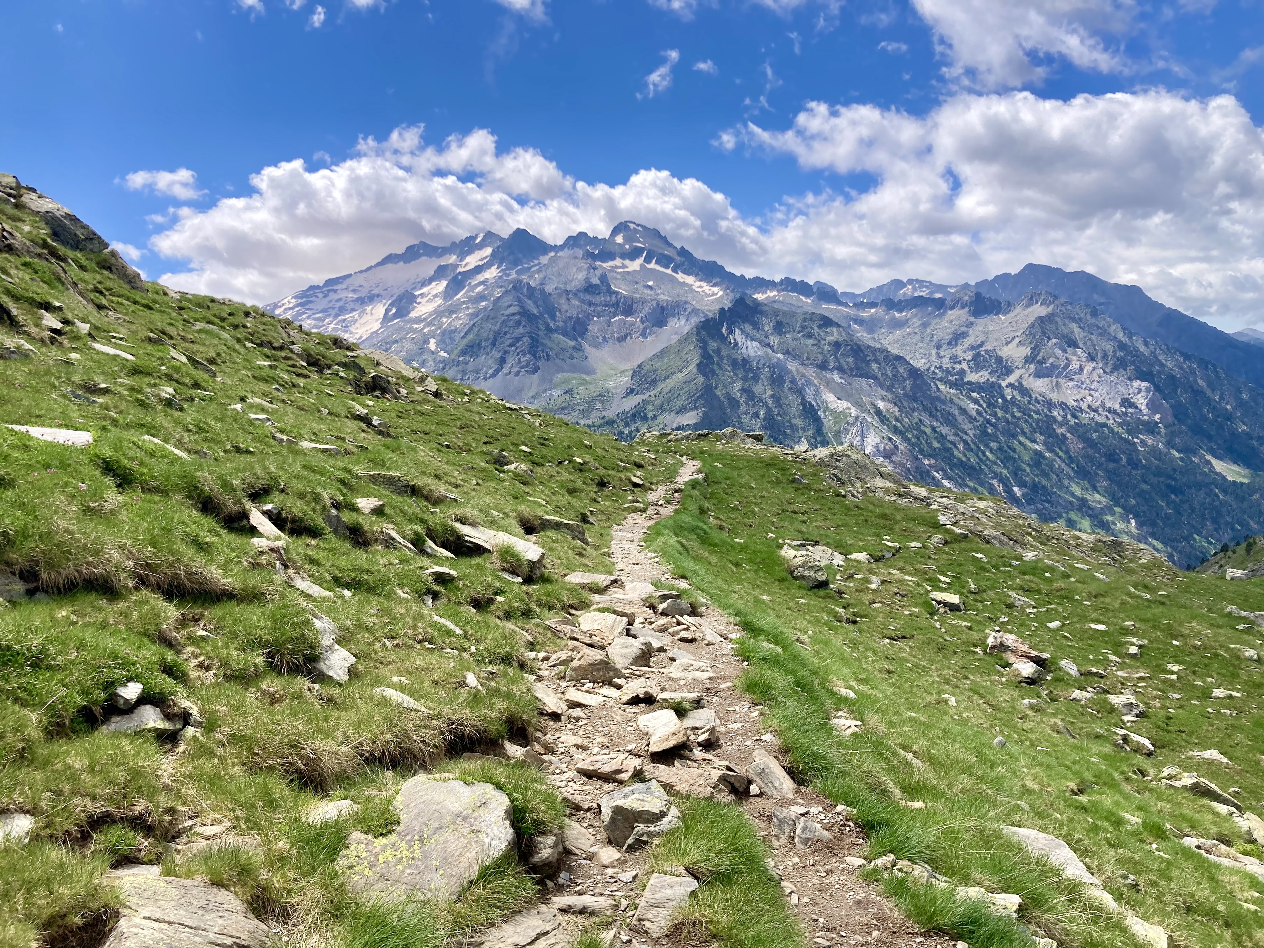 La subida al Portarró d’Espot no se me hace especialmente dura. Lo más bonito es ir viendo cómo cambia la vista del lago, de los lagos, conforme subo. Es un puerto amplio y hay que acercarse al mirador (otros quince minutos andando) para poder asomarse al otro lado. Me gusta verlo porque, al contrario que esta parte del Parque, aquello sí lo conozco: Sant Maurici, el Port de Amitges… Y ver ya también desde aquí montañas más lejanas, las de la frontera andorrana, con la Pica d’Estats a la cabeza.