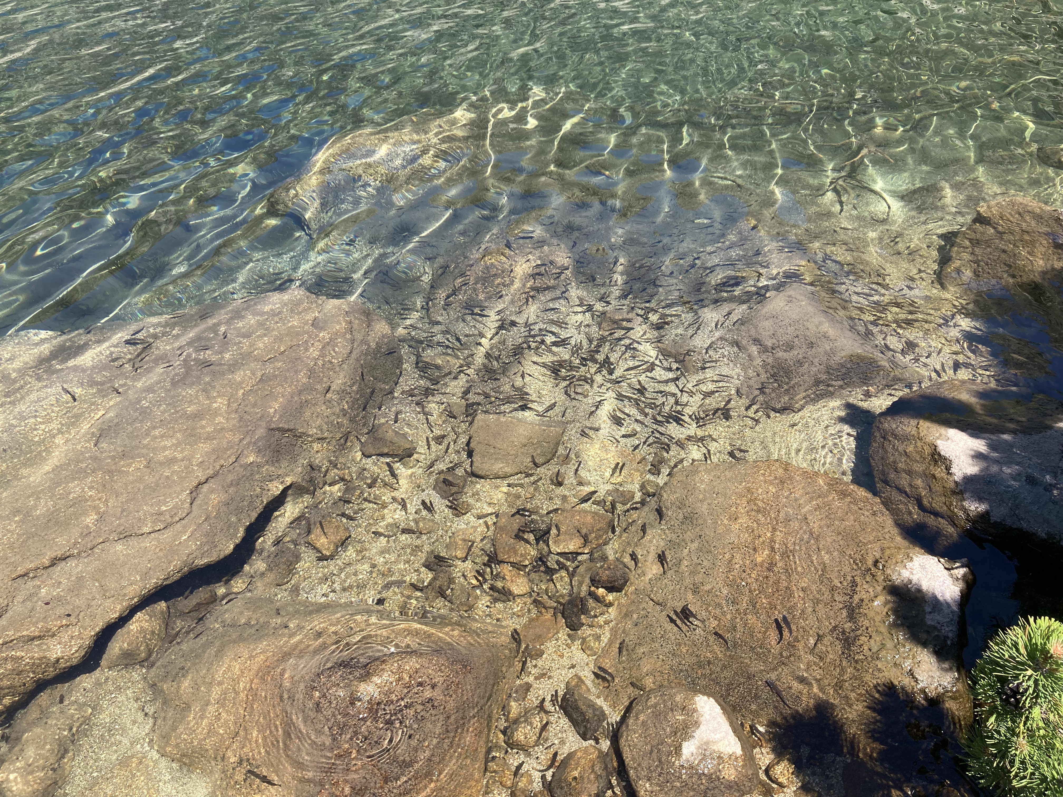 Siguiendo, ahora ya sí, por un sendero (y siguiendo corriente arriba el recorrido de las aguas), está el Estany Redó (el lago redondo, para que nos entendamos), más discreto, más elevado, más escondido, y rodeado de paredes grises tiznadas de negro. Es aquí donde paro a comer, mirando las «manadas» de peces diminutos (¿esto se llama también cardumen?). Me llama la atención cómo su movimiento apacible se vuelve a veces espasmódico, como si todo el grupo hubiera recibido alguna suerte de descarga eléctrica, o como si respondiera, rapidísima y coordinadamente, a las instrucciones de una directora de orquesta invisible.