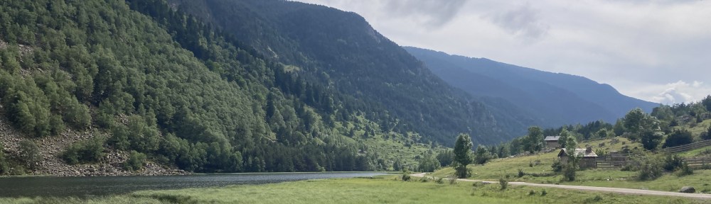 El camino hasta llegar al Estany Llong es idílico además de sencillo. Un paseo súper agradable por un pista ancha que corre paralela al rio Sant Nicolau. Es la perfecta imagen de montaña, la de los cuentos (los cuentos de nuevo): el río, el verde, las flores, las montañas… y todo ello sin apenas desnivel, lo cual, a estas alturas (a 2000 metros de altura) es más que raro. Es un paraíso que culmina en la gran masa de agua que es el Estany Llong y en la ancha llanura verde que lo rodea, donde, cómo no, pacen apaciblemente un buen puñado de vacas.