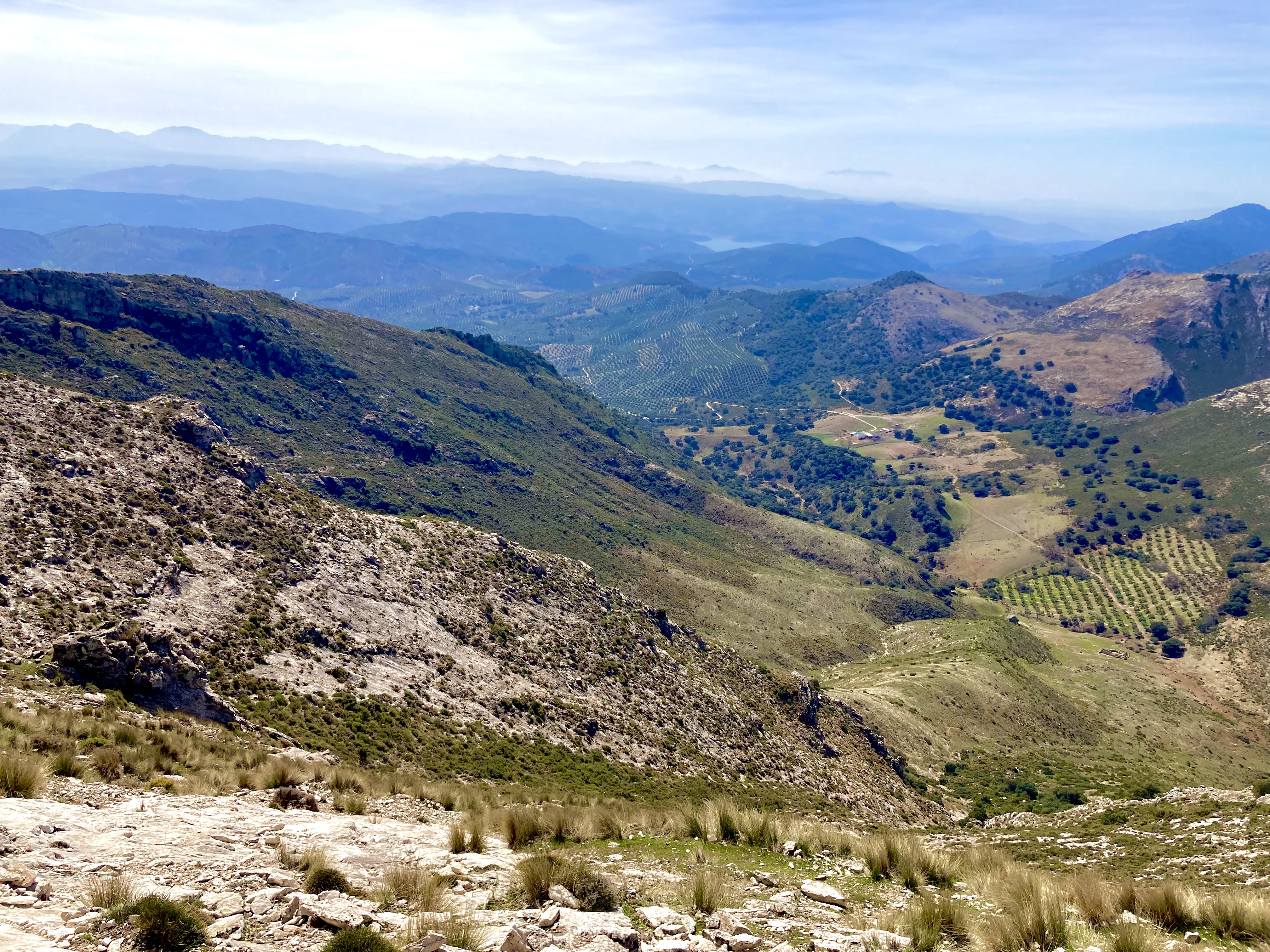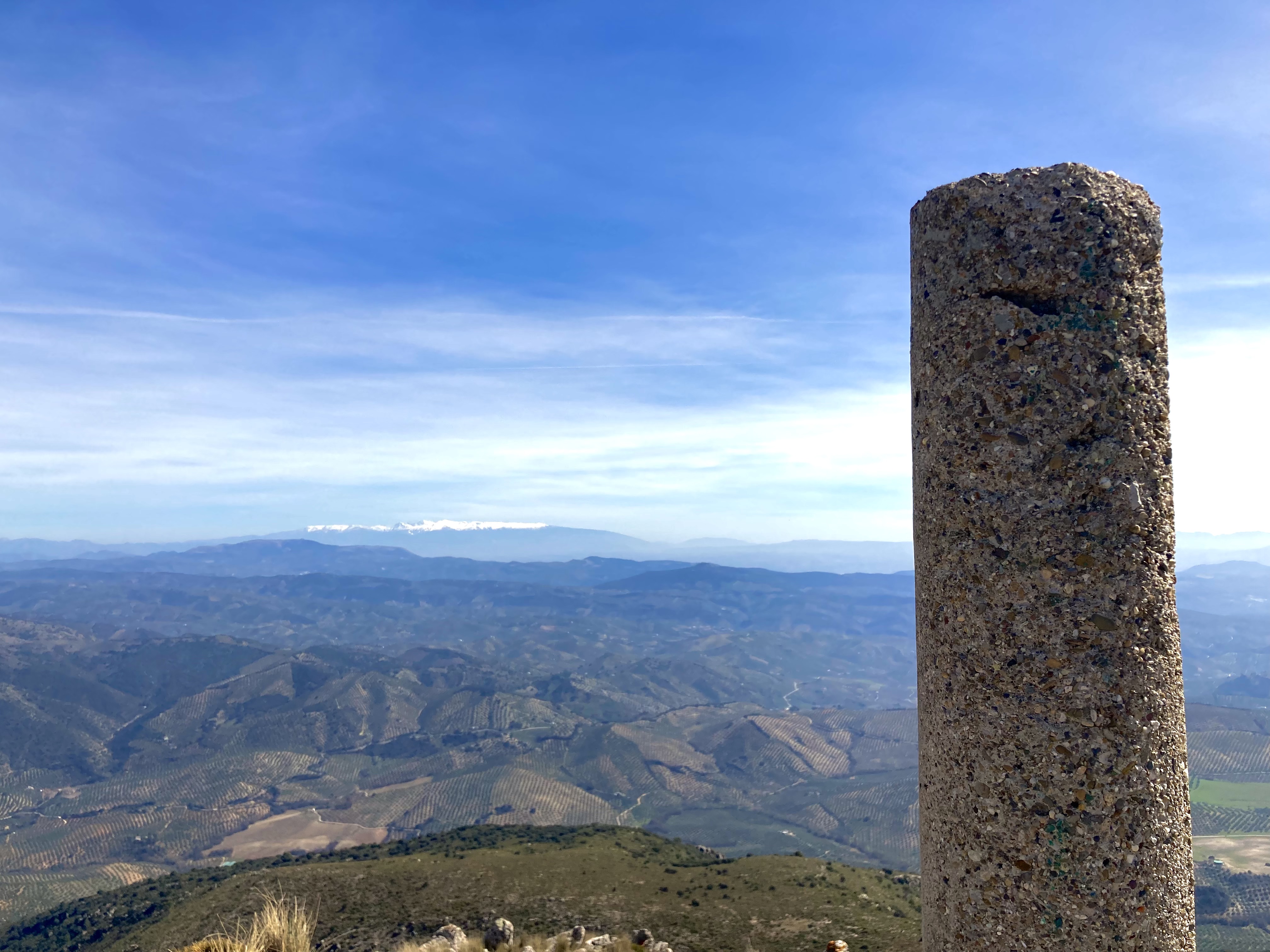 Sí y no. Entiendo que no es fácil. Que la pendiente inicial es muy pronunciada. Que hay algún que otro paso donde las manos son, si no necesarias, al menos útiles. Que quizá no está recomendado para quien tenga vértigo. Que hay que ser un poco cabra… Pero quizá por eso para mí es entretenido, y lo disfruto a pesar de que el ayuno de montaña del invierno hace que no esté tan en forma como me gustaría. Pero fácil o difícil, lo que sí tiene la Tiñosa son unas vistas espectaculares. Trescientos sesenta grados de olivar infinito, inabarcable, solo interrumpido, al sur, por el embalse de Iznájar y la imponente e inconfundible Sierra Nevada (que en esta época hace honor a su nombre manchando de blanco el horizonte). ¿Y esto está a poco más de dos horas de casa?